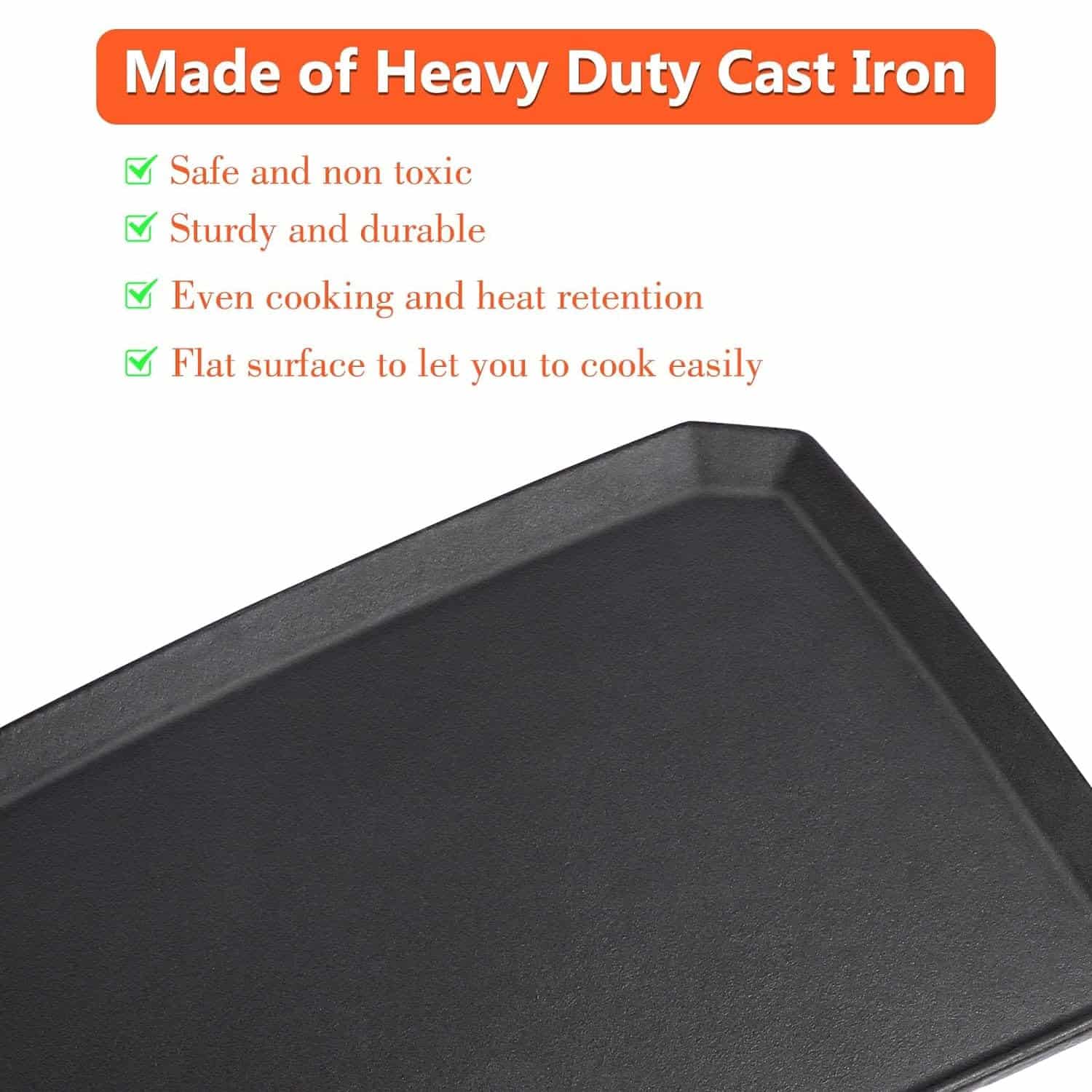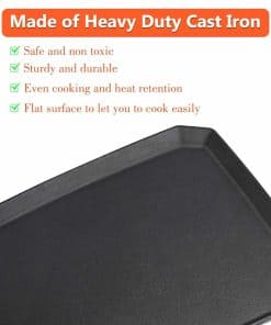 2. Material – Hierro fundido mate. Duradero y de excelente calidad, fácil de limpiar. Dimensiones – 15.19 x 9.68 x 0.5 pulgadas (L x A x H), superficie de cocción de 135 pulgadas cuadradas.