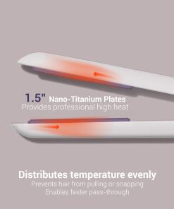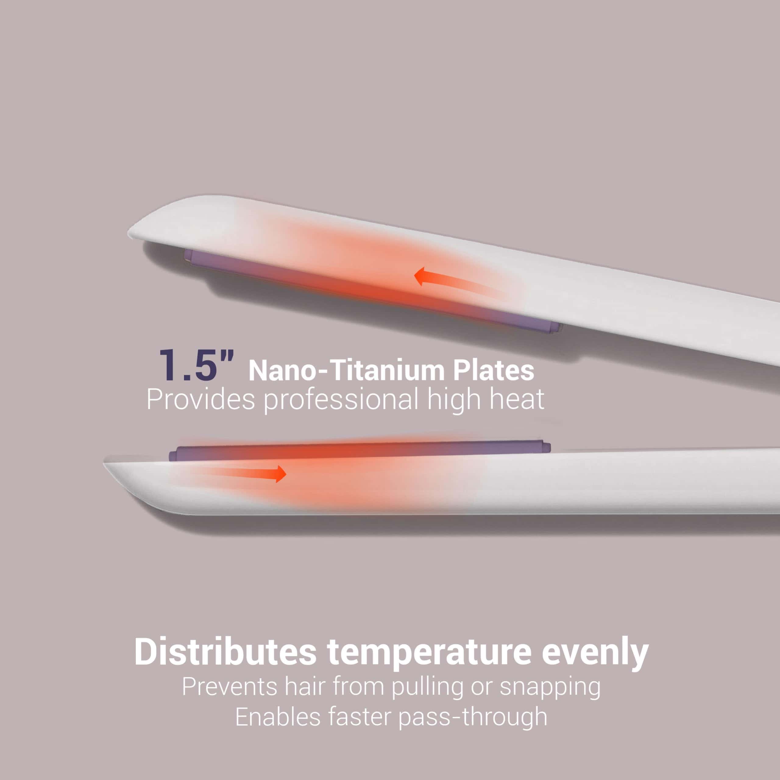 3. Placas de Titanio de 1.5 pulgadas: Con placas de titanio nano premium de 1.5 pulgadas de ancho, esta plancha de pelo de titanio proporciona una distribución de calor uniforme y un control de temperatura estable, lo que hace que el peinado sea más fácil y menos dañino para tu cabello.