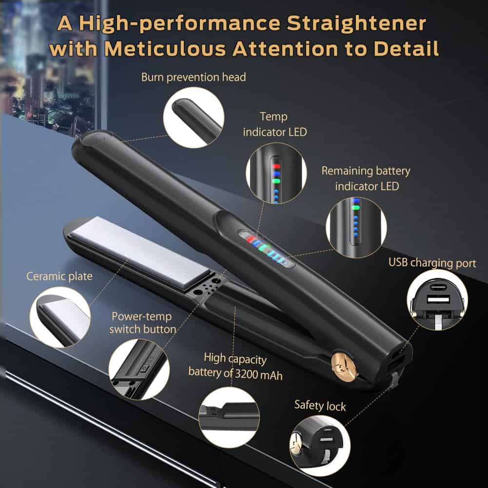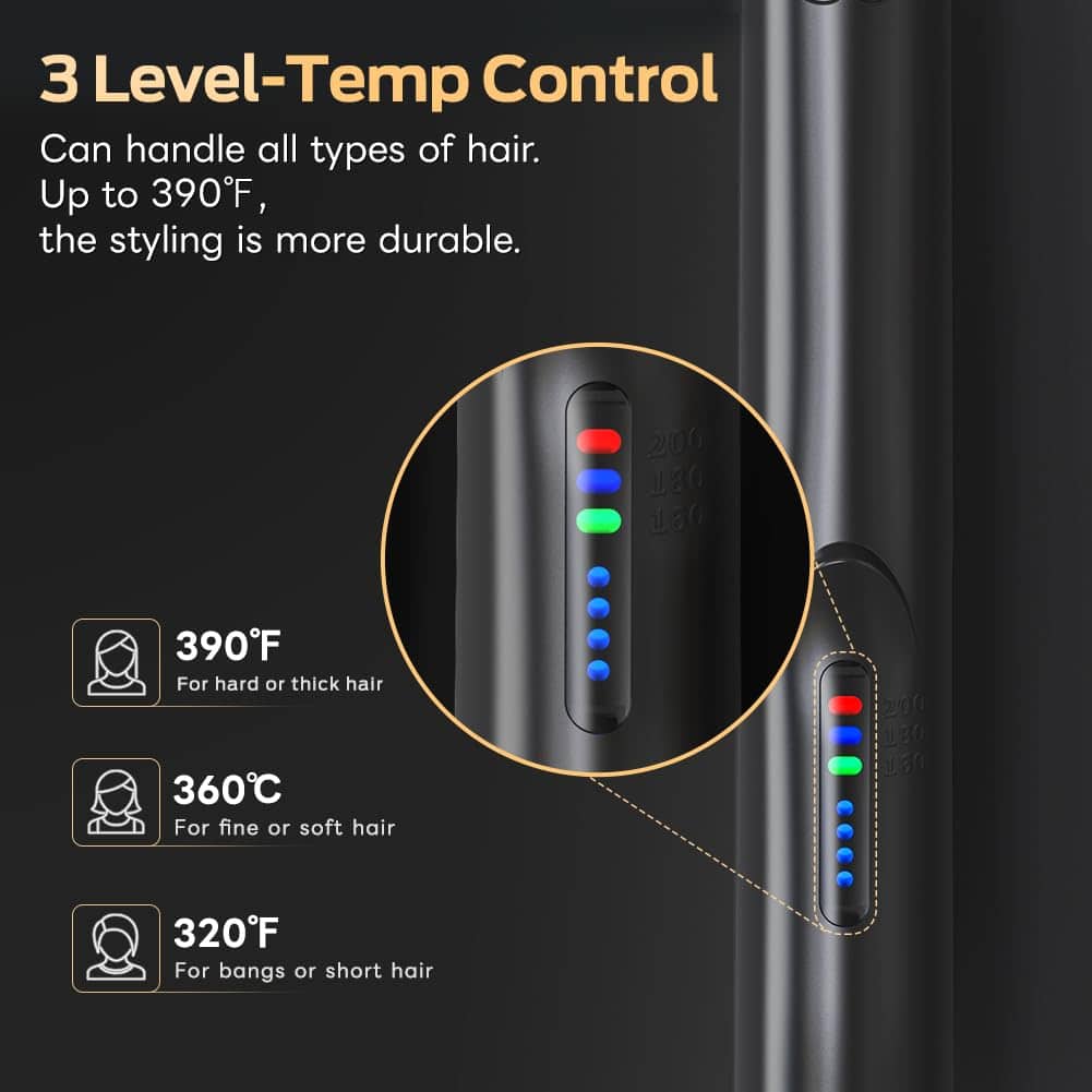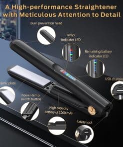 Plancha y rizadora 2 en 1 de cerámica con diseño inalámbrico y tamaño mini que facilita el estilizado. Puede girar 360 grados y no interfiere durante el uso, perfecta para viajes, exteriores, viajes de negocios, en casa, ¡disponible en cualquier lugar! ¡Ideal para maquillarse antes de una cita! También es perfecta para uso en el extranjero, di adiós a los cables obtrusivos. Ajuste profesional de temperatura de 3 etapas: 390 para cabello duro o grueso, 360 para cabello fino o suave, 320 para flequillo o cabello corto. Batería grande con capacidad de 3200 mAh, puede usarse por más de 30-40 minutos con un tiempo de carga de 3 horas. Equipada con placa calefactora de cerámica para una rápida conducción de calor y un acabado perfecto. Calentamiento desde el núcleo para un peinado firme y de alta calidad. Con calentador ultra delgado para un control preciso de la temperatura y generación uniforme del calor. Función de reposición de temperatura que mantiene el calor constante sin dañar el cabello. Placa calefactora de 18 mm, ideal para flequillos y cabello corto de hombres, diseño corporal circular que también permite rizar el cabello.