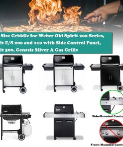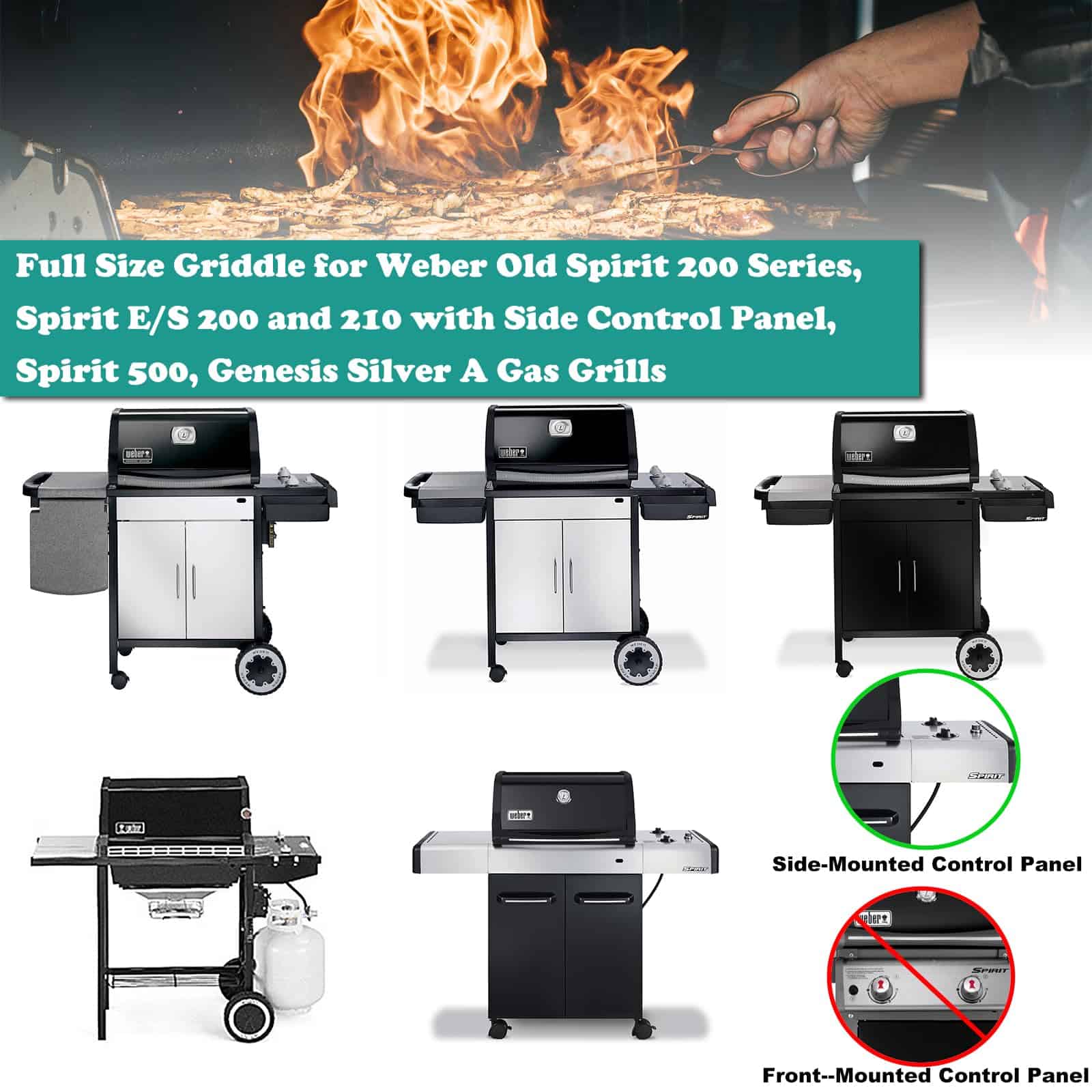 1. Perfecto para Weber Spirit 200/210 Serie Antigua Compatible con las series antiguas de Weber Spirit 200 con panel de control montado en el lateral, como las series Spirit 200, Spirit 210 (no es compatible con los modelos de panel de control montado en el frente). Perfecto para Weber Spirit 500, Genesis Silver A; Compatible con los modelos de piezas de parrilla de gas Weber Número de modelo Plancha de parrilla de tamaño completo modelos compatibles: 2241298, 2271001, 3711001, 4411001, 4511001, 6711001, 6711411.