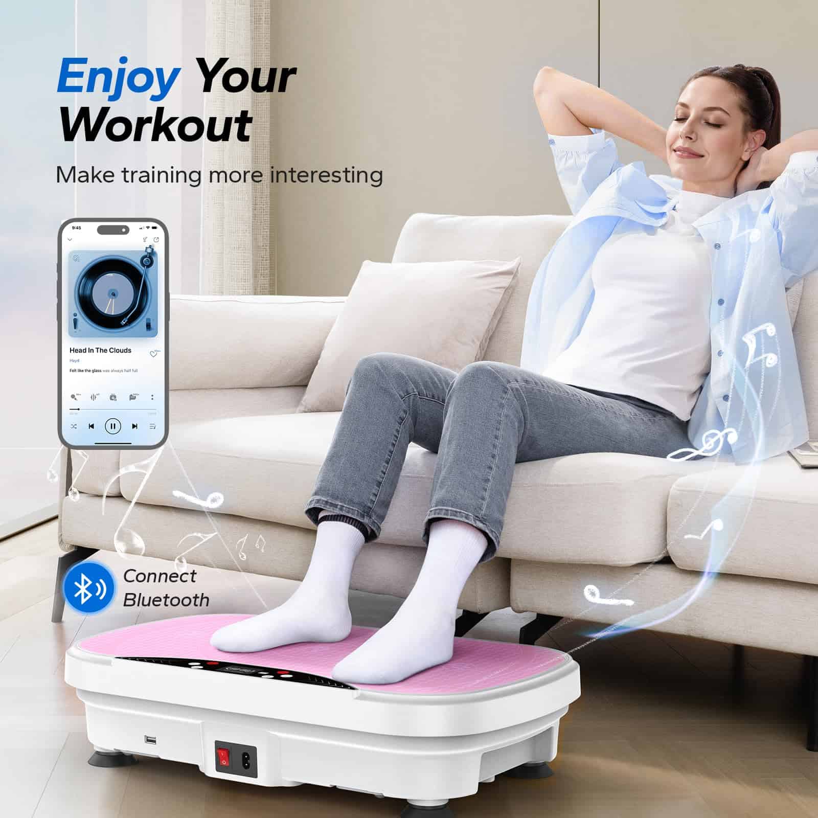 4. Funciones avanzadas para su conveniencia: Eleve sus sesiones de entrenamiento con funciones premium diseñadas para inspirar y motivar. La placa de vibración viene equipada con 2 cuerdas para mejorar los ejercicios de la parte superior del cuerpo, un control remoto fácil de usar para un control sin problemas y una pantalla LED clara para realizar un seguimiento del progreso. Para mayor disfrute, el altavoz Bluetooth integrado le permite reproducir su música favorita, transformando cada entrenamiento en una experiencia atractiva y vigorizante.