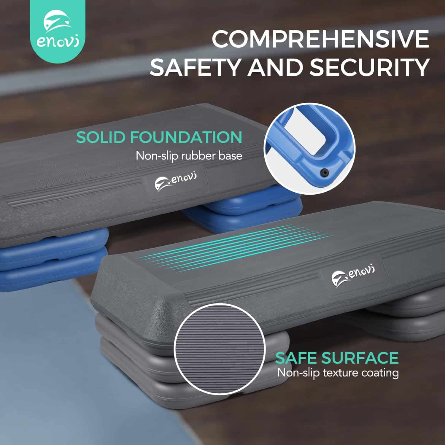 3. Seguridad Primero: La Plataforma de Ejercicio Enovi Step cuenta con un diseño antideslizante tanto en la superficie del paso como en la base, garantizando que tu entrenamiento sea seguro.