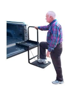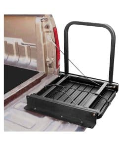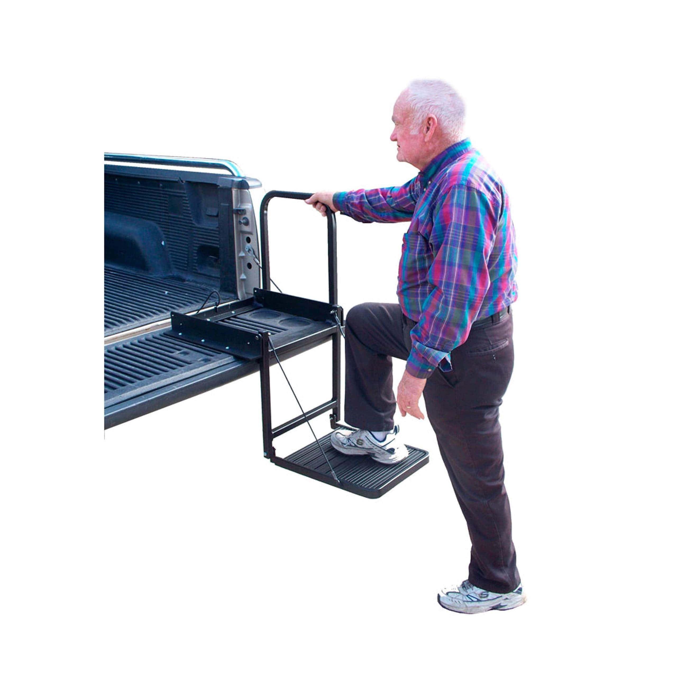 El Truck N’ Buddy de Great Day es lo mejor que le puede pasar a un propietario de camioneta El Truck N’ Buddy crea un mundo completamente nuevo de posibilidades y comodidades para los propietarios de camionetas – un paso superior para las mascotas envejecidas, un paso superior para los propietarios de camionetas envejecidos, un asiento perfecto para cazadores, para tiradores de arcilla deportiva, para los entusiastas de NASCAR y del fútbol – un asiento para los golfistas para cambiarse de zapatos, para acampar, y para manipular cómodamente trabajos diversos. ¿Tienes una camioneta Ya no luches por acceder a ellas El Truck N’Buddy hará que entrar y salir sea conveniente y mucho más seguro para ti. El Truck N’ Buddy TNB2000B se monta en la cola de las camionetas de carga estándar o en el piso de remolques de equipos y camiones de plataforma con tornillos de metal y se puede colocar para permitir un fácil acceso o salida. El Truck N’ Buddy también está disponible para adaptarse a camionetas con cubiertas de cama. Con el modelo TNB2001B, puedes disfrutar de la conveniencia de un acceso rápido y fácil a la cama de la camioneta. El TNB2001 se monta al ras con el borde exterior de la cola de una camioneta con una cubierta de cama. El Truck N’ Buddy está construido con aluminio de aviación resistente y acabado en un recubrimiento negro súper resistente que se combina bien con cualquier vehículo y garantiza años de servicio confiable. El modelo TNB2000B pesa 16 libras. El modelo TNB2001B pesa solo 14 libras. La capacidad máxima de peso es de 300 libras. La plataforma de paso / asiento del Truck N’ Buddy está soportada por cables de prueba de 1700 libras y cuenta con crestas de tracción antideslizantes incorporadas para un apoyo seguro. También cuenta con un práctico pasamanos de 18 pulgadas para garantizar una entrada segura a la camioneta. El Truck N’ Buddy se pliega y despliega sin esfuerzo en segundos para hacer el trabajo en cuestión y se guarda de forma compacta fuera del camino. La cubierta de la cama de la camioneta y la puerta trasera se cierran por completo una vez que se instala el Truck N’ Buddy y está en la posición plegada. NOTA: Puede ser necesario realizar modificaciones y/o taladro en el vehículo para la instalación