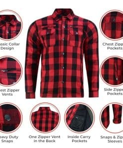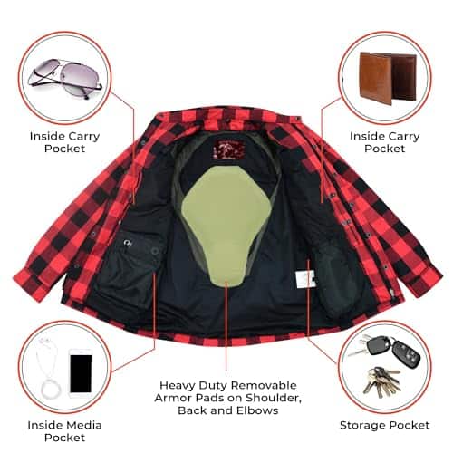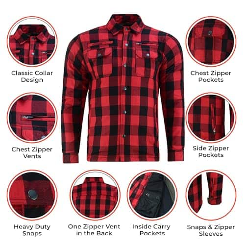 Calidad Premium: Las camisas de motociclista a cuadros Renegade Flannel para hombres están hechas de Algodón Duradero, lo que las convierte en una camisa de motociclista elegante y duradera para hombres. Nuestra camisa de motociclista con armadura cuenta con un forro interno duradero y de larga duración para mayor comodidad, junto con refuerzos de Kevlar en los hombros, codos y espalda para una protección superior al conducir. Comodidad Todo el Día: Nuestra camisa de motociclista a cuadros incluye una ventilación en la parte trasera con una cremallera impermeable, así como almohadillas de armadura extraíbles CE Aprobadas en los hombros, espalda y codos para protección. Nuestra camisa de motociclista a cuadros para hombres cuenta con un soporte de hombro reforzado, ofreciendo una durabilidad mejorada y un almacenamiento seguro para tus elementos esenciales. Las camisas de kevlar para motociclistas tienen una cremallera resistente al agua oculta debajo del broche en el cuello y un bolsillo interior para medios con alimentación por cable. Conduzca con Estilo: Nuestra ligera camisa de motociclista a cuadros para hombres combina estilo con múltiples opciones de almacenamiento. Cuenta con dos bolsillos frontales en el pecho con cierres de broche, dos bolsillos impermeables con cremallera en las manos, dos bolsillos internos de alta resistencia con fundas incorporadas y un bolsillo interno regular. Su diseño deportivo añade un aspecto elegante y atractivo. Lo Mejor para Ti: Las camisas de motociclista a cuadros Renegade para hombres vienen en una variedad de tallas que van desde S – 6XL para asegurarte de conseguir lo mejor. Nuestra camisa de motociclista para hombres es un estilo inteligente y moderno para usar, ideal para motociclistas que quieren permanecer en la carretera. Para más detalles, por favor consulta la imagen de la tabla de tallas. Nuestro Compromiso Contigo: Las camisas de motociclista a cuadros Renegade son fabricadas por Daniel Smart, priorizamos tu satisfacción al ofrecer equipamiento para motociclistas de alta calidad que mejora tu experiencia de conducción. Desde equipo de motocicleta premium hasta elegantes camisas de protección para motociclistas, estamos comprometidos a ofrecer productos que brinden un valor excelente y cumplan con tus expectativas.