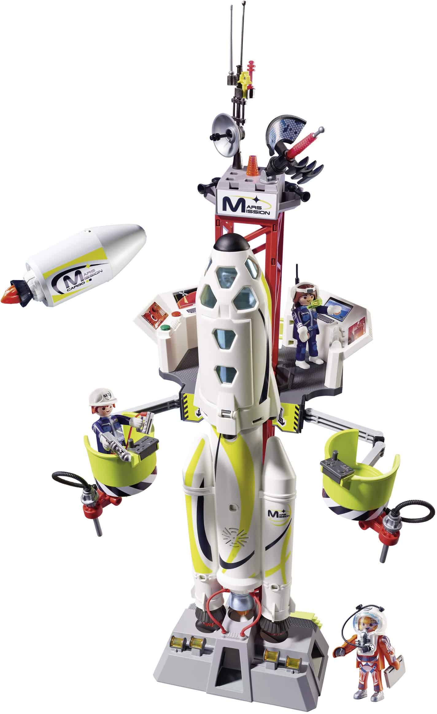 ¡Prepara el cohete listo para el espacio con este set de juego! Equipado con luces y sonidos que funcionan, este Cohete está listo para viajar al espacio. ¡Ayuda a la tripulación a afinar y revisar todo a través de la plataforma de mantenimiento! Sienta hasta dos astronautas en la cabina del cohete, donde pueden dirigir la nave hacia Marte. Cuando llegan al Planeta Rojo, los niños pueden operar el contenedor de transporte y la cápsula espacial por separado del cohete y acoplarlos en la estación espacial de Marte (se vende por separado el set 9487). Los efectos de luces y sonidos en funcionamiento del cohete, incluyendo una cuenta regresiva, propulsores y comunicación espacial, ¡dan vida a la acción espacial (se requieren 2 pilas AA). ¡Este set también se puede combinar con el satélite láser de meteoroides (se vende por separado el set 9490) para obtener más diversión! Dimensiones: 8.6 x 11 x 28.3 pulgadas (LxWxH). Recomendado para niños a partir de seis años. Advertencia. PELIGRO DE AHOGO. Contiene una bola pequeña y piezas pequeñas. No apto para niños menores de 3 años.
