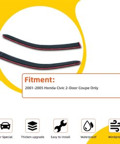 Compatible con el Civic de 2 puertas Coupe 2001-2005 exclusivamente. Este juego incluye 2 viseras de ventana delanteras para proteger sus ventanas de la lluvia y el sol. Hechas de acrílico reforzado con un tinte ahumado oscuro para un aspecto moderno. El estilo de montaje exterior se adhiere fácilmente a la puerta y sobre las ventanas, evitando la necesidad de cortar o perforar. La instalación es sencilla con el diseño de cinta directa, sin complicaciones. Asegúrese de comprobar la compatibilidad de su vehículo y siga las instrucciones proporcionadas para una instalación adecuada y segura.