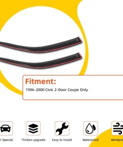 Este conjunto de 2 deflectores de ventanas exteriores de PLDDE está diseñado específicamente para ser compatible con el Honda Civic 2-Door Coupe/3-Door Hatchback fabricado entre los años 1996 y 2000. Los deflectores están hechos de acrílico reforzado de color humo y vienen con cinta 3M para una instalación segura y fácil. Estos deflectores ayudan a reducir la acumulación de calor en vehículos estacionados al permitir que entre aire cuando las ventanas están parcialmente abiertas. Además, protegen completamente las ventanas del sol, viento, lluvia y nieve. El estilo de instalación es exterior, no en canal. Se incluye una garantía limitada de 6 meses para mayor tranquilidad. ¡Protege tus ventanas y disfruta de una conducción más cómoda con estos deflectores de ventanas exteriores PLDDE!