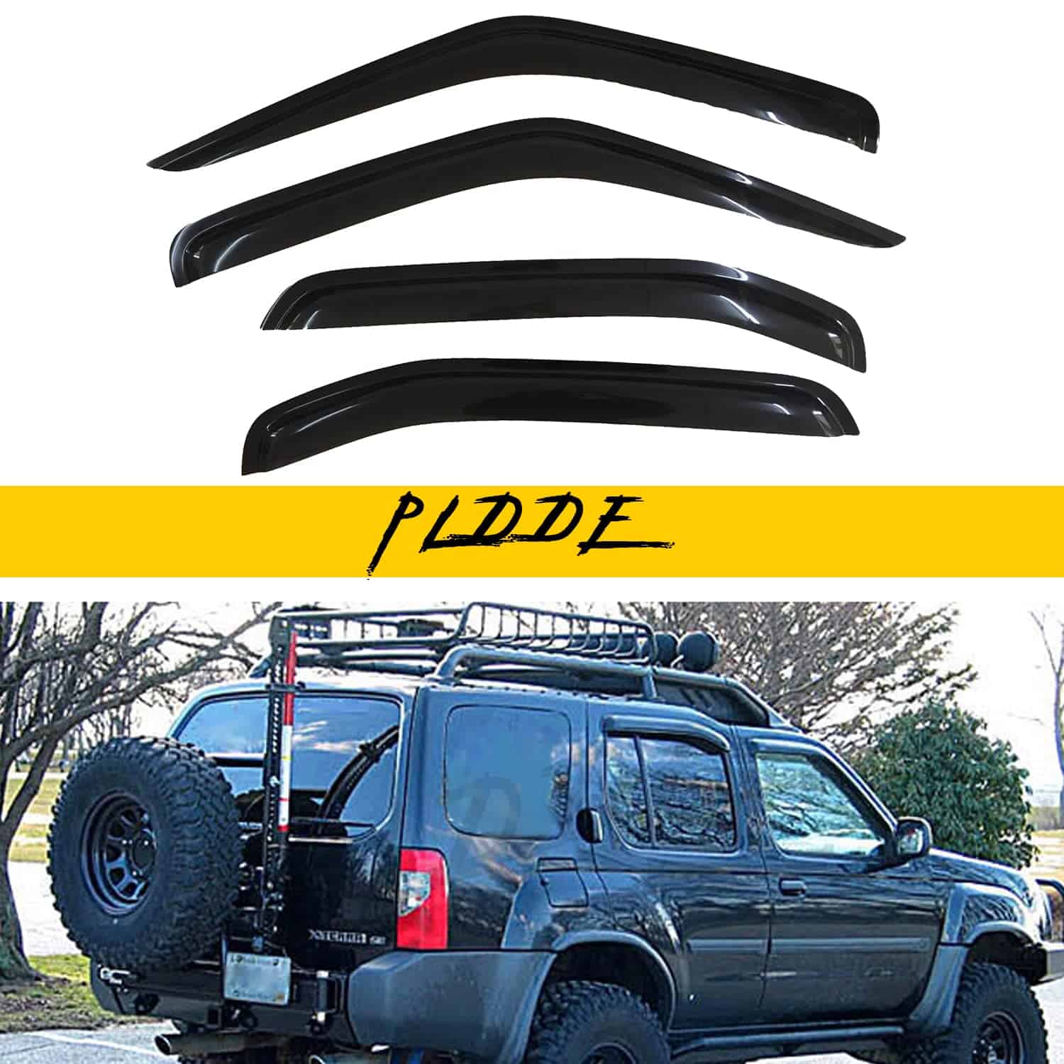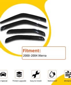 Fitment: Compatible con Xterra 2000-2004. Incluye 4 piezas para la ventana delantera y trasera (conductor y pasajero) con cintas adhesivas de doble cara 3M. Color: Tono de humo oscuro; Material: Acrílico reforzado. Estilo: Estilo de montaje exterior (se adhiere a la puerta y sobre las ventanas. No es estilo en canal). Tipo de instalación: Diseño directo de cinta adhesiva. No requiere corte ni perforación. Puede consultar la imagen de instalación que publicamos para referencia. Diseño de fácil pelar y pegar.
