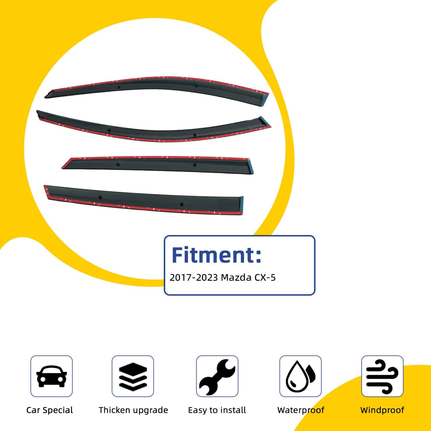 Las Viseras de Ventana Tintada PLDDE JDM son la solución perfecta para protegerte del sol y la lluvia mientras agregan estilo a tu Mazda CX-5. Fabricadas en PVC de alta calidad, estas viseras no solo tienen un aspecto elegante, sino que también son duraderas y resistentes a la intemperie. Fáciles de instalar con un diseño de montaje exterior, se aseguran a la ventana con cinta 3M y clips incluidos. No necesitas realizar cortes ni taladros complicados, y las viseras se pueden instalar en poco tiempo. Disfruta de la comodidad y la protección que te brindan estas viseras mientras conduces tu Mazda CX-5. Con una garantía limitada de 6 meses, puedes estar seguro de la calidad y durabilidad de este producto.