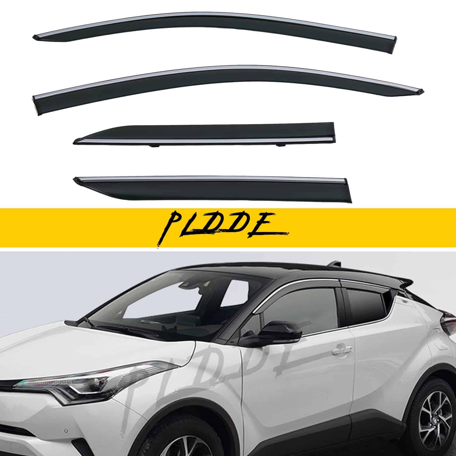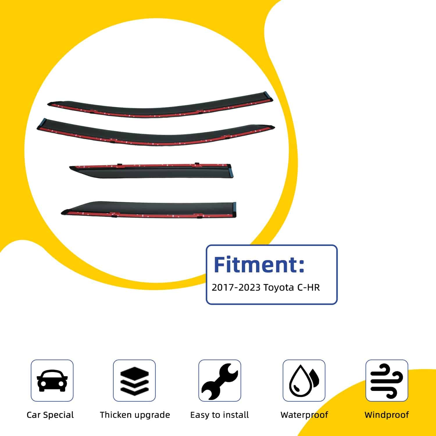 1. Compatible con Toyota C-HR 2017-2024. 2. Ofrecido: 1 juego completo de 4 piezas (2 izquierda y 2 derecha) Viseras de Ventana con tinte de humo y detalle cromado mostrado en las imágenes. 3. Estilo: Estilo de Montaje Exterior (No estilo en canal). 4. Diseño fácil de Adhesivo/Clip. Se asegura a la ventana con cinta 3M y clips (incluidos). No se requiere cortar ni taladrar. Puede consultar la imagen de instalación que publicamos como referencia. 5. Hecho de PVC de alta calidad y fabricado con un proceso de moldeo por inyección que garantiza resistencia de servicio pesado y un aspecto suave.