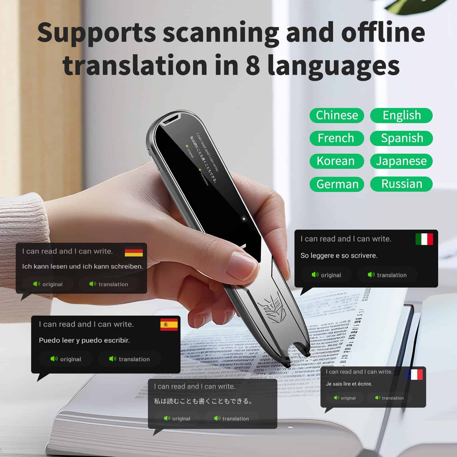 2. Traductor de voz de 112 idiomas La pluma traductora admite traducción de escaneo en línea en 55 idiomas y traducción de voz en tiempo real en 112 idiomas. Admite acentos multinacionales, velocidad de salida de voz ajustable. Es la mejor opción para tomar notas, grabar reuniones, viajar al extranjero, presentar exámenes y hacer regalos.