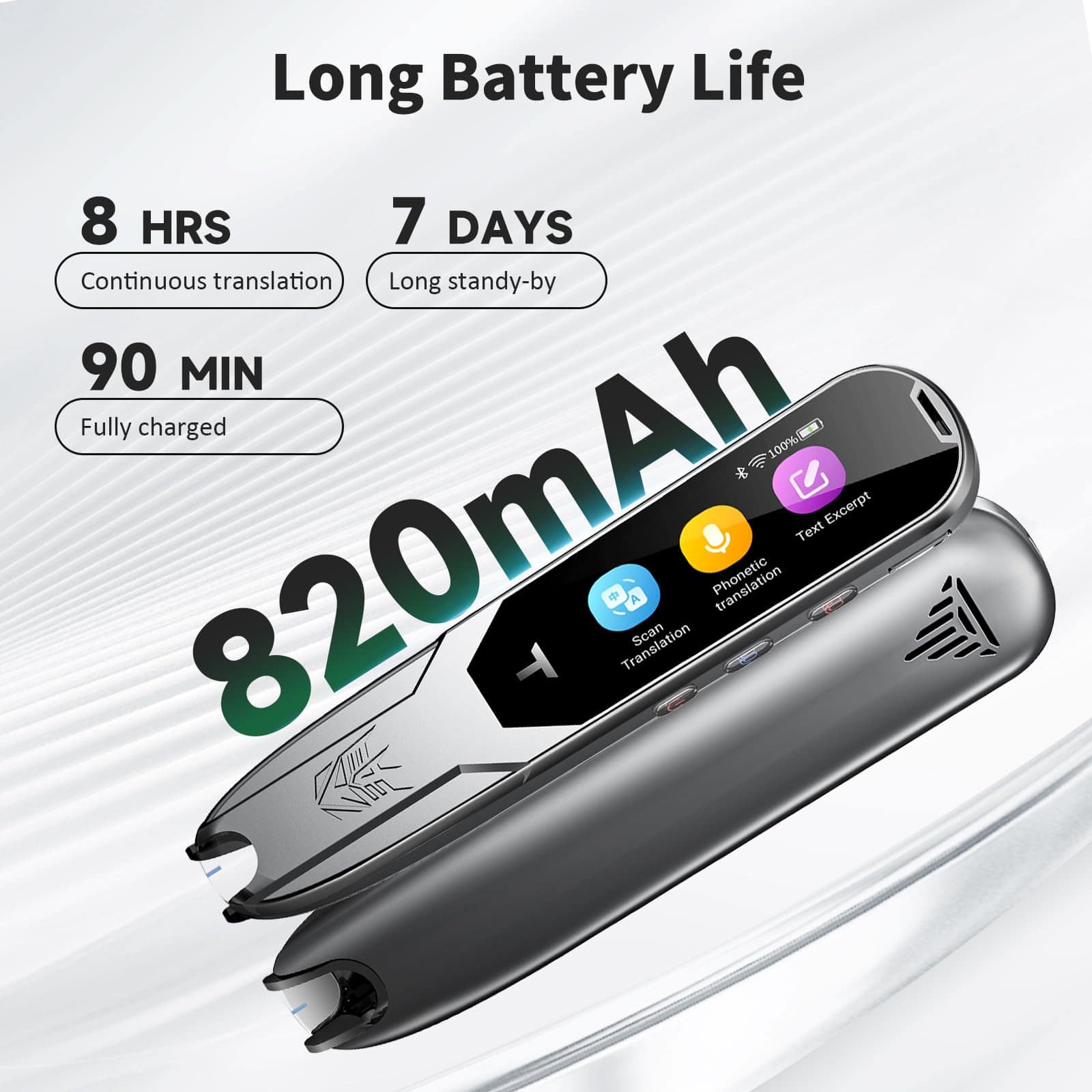 4. Traducción sin conexión Incluso cuando no hay red, la pluma de traducción de escaneo también admite escaneo y traducción sin conexión. La potente función de diccionario electrónico chino-inglés es la mejor opción para que aprendas inglés. ¡La batería de alta capacidad de 900mAh soporta hasta 8 horas de trabajo continuo y 7 días de tiempo de espera!