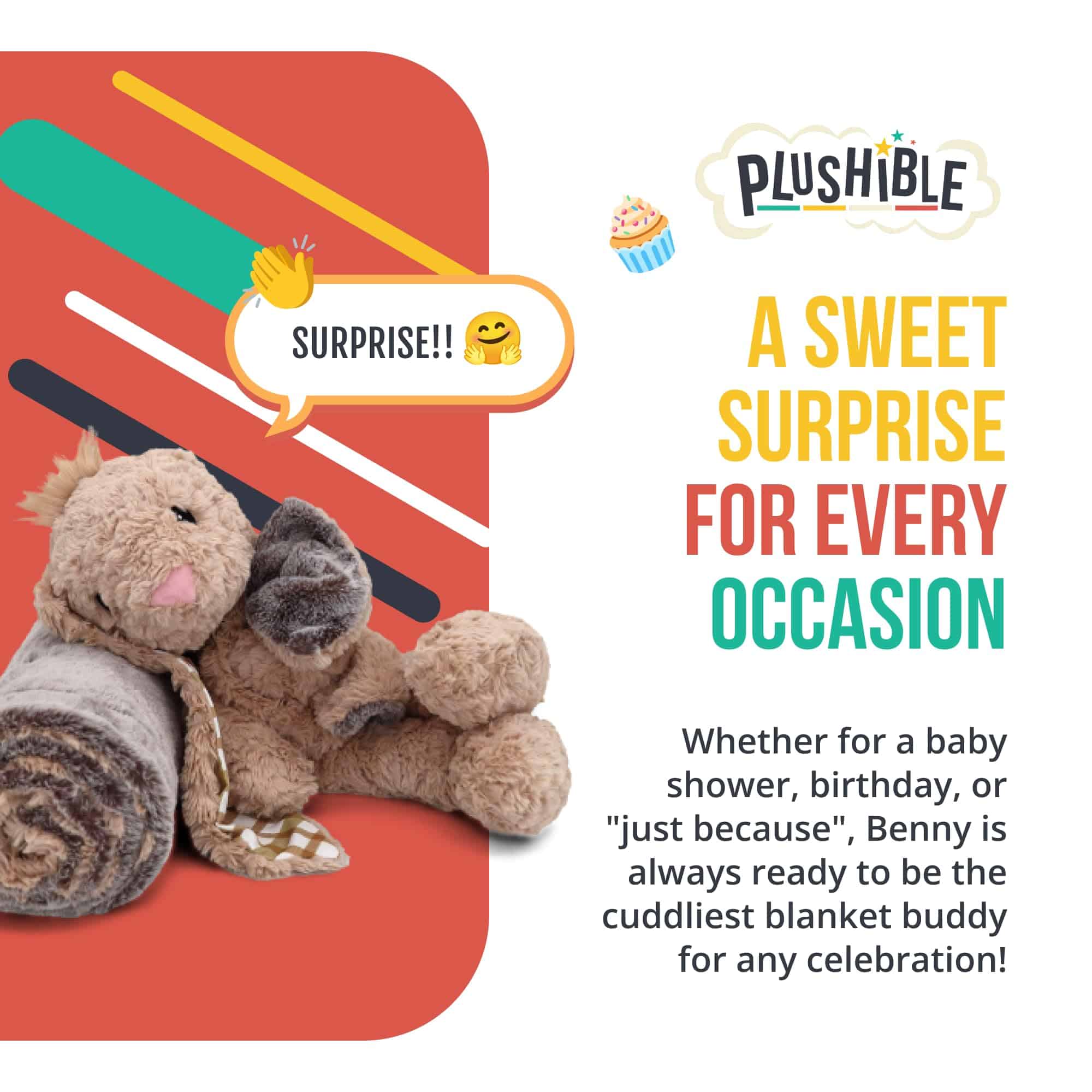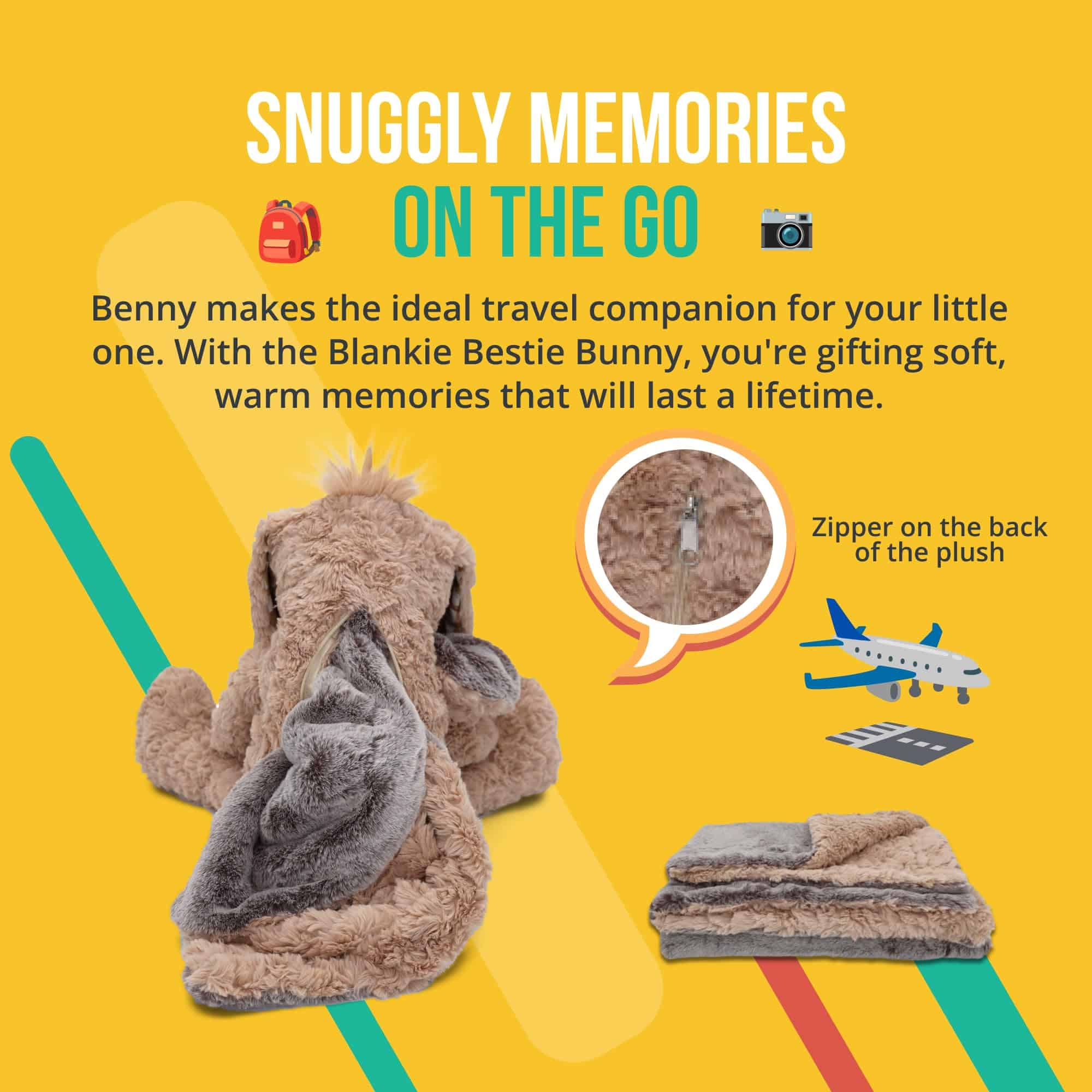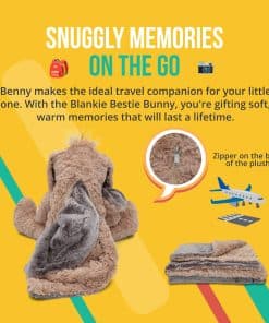 PLUSHIBLE BRIDGING MILES WITH SMILES Benny Bunny Blankie Bestie es la combinación perfecta entre un juguete de peluche y una manta de apego para bebé. Este adorable duo ofrece comodidad y compañerismo, siendo un compañero cálido y acogedor para tu pequeño. El peluche de conejito Benny Bunny cuenta con una manta súper suave escondida en su interior, asegurando horas de abrazos y amor. Con un diseño compacto y portable, este set de juguete de peluche y manta es ideal para los niños en movimiento. Además, su versátil diseño lo convierte en un regalo conmovedor para baby showers, cumpleaños, y más. Con PLUSHIBLE BRIDGING MILES WITH SMILES Benny Bunny Blankie Bestie, tu pequeño siempre tendrá un compañero reconfortante para sus aventuras en casa, de viaje, en la hora de dormir o durante el tiempo de juego.