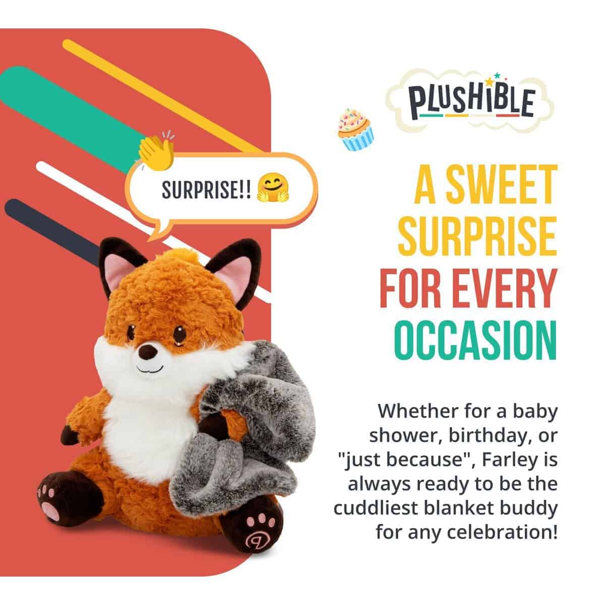 2. DISEÑO 2 EN 1 DE PELUCHE Y MANTA: Más que un juguete, Farley Fox presenta una manta súper suave oculta en su interior. Perfecta como una manta de peluche, la costura duradera de Farley Fox garantiza un juego seguro para su pequeño, libre de piezas de plástico.