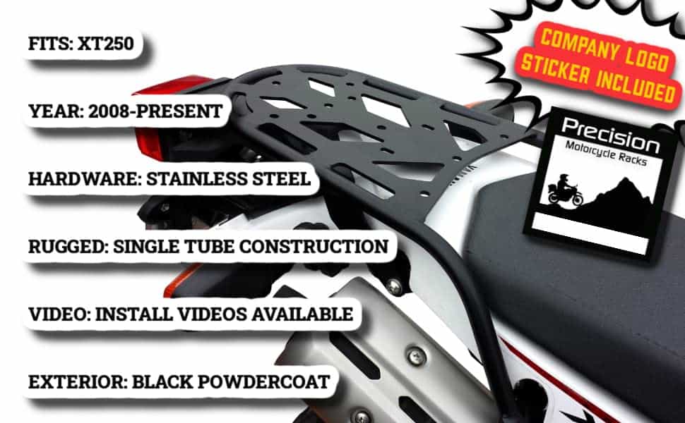 Portaequipajes trasero XT250 para motocicletas 2008-Presente. Instalación RÁPIDA y FÁCIL. Ajuste PERFECTO. Perforado previamente para aceptar montajes RotoPax y prácticamente todas las marcas populares de equipaje. ¡Bolsas Rolie y bolsas para colas se adaptan GENIAL! Nos enorgullecemos de nuestra artesanía de ALTA CALIDAD y servicio al cliente.
