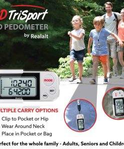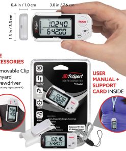 El Podómetro 3DTriSport Walking utiliza la última tecnología de sensor 3D Tri-Axis para rastrear tu actividad diaria con una precisión sobresaliente. Registra tus pasos (caminata y carrera), distancia (km y millas), calorías quemadas y tiempo de ejercicio. También almacena hasta 30 días de tus registros diarios, ayudándote a seguir tu progreso y mantenerte motivado para alcanzar tus metas de fitness. Con la tecnología de sensor 3D Tri-Axis más reciente para registrar con precisión tu actividad en cualquier posición, clip it en tu cintura, úsalo alrededor de tu cuello con el cordón incluido o colócalo en tu bolsillo o bolso. Características adicionales como una pantalla grande clara y fácil de leer, reloj incorporado y objetivo de pasos. Nuestro soporte es amigable y sin complicaciones. Si necesitas ayuda con la configuración o tienes alguna pregunta, ¡estamos aquí para ayudarte! Tu contador de pasos viene con una garantía de 18 meses. ¡Satisfacción garantizada al 100%!