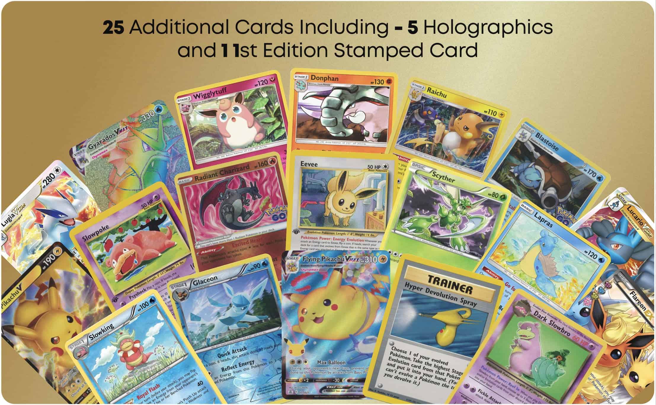 Pokemon TCG: Caja de Colección de Cartas Misteriosas Clasificadas – Cada caja contiene 1 Carta Clasificada + 25 Cartas Adicionales incluyendo 5 hologramas y 1 carta con sello de Primera Edición, 1 paquete de refuerzo sellado de 10 cartas y 1 carta de código. La carta clasificada tendrá una calificación de 8 o superior. El paquete de refuerzo será de uno de los siguientes sets: Paldea Evolved, Crown Zenith, Astral Radiance, Chilling Reign, Battle Styles, Shining Fate, Vivid Voltage, Champion’s Path, XY Evolutions, Battle Styles Chilling Reign, Evolving Skies, Fusion Strike o Brilliant Stars. La carta clasificada será de PSA, CGC, GMA o Beckett.