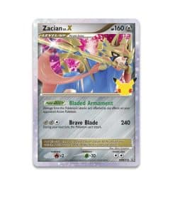 Pikachu se une a las fuerzas del Legendario Pokémon Zacian para una genial colección del Juego de Cartas Pokemon que ayuda a conmemorar 25 años de buenos momentos y grandes aventuras. El querido Pokémon de tipo eléctrico está aquí como un elegante pin que presenta a Pikachu surcando las olas y los cielos. Zacian aparece en una carta promo especial de Zacian LV.X que recuerda a los Pokémon LV.X que se introdujeron por primera vez en la expansión Diamante y Perla en 2007.