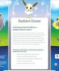 ¡Una sonrisa brillante y pelaje esponjoso, ¡Eevee Radiante está aquí! Con su coloración única, los Pokémon Brillantes suelen ser difíciles de encontrar, pero el adorable Eevee Radiante está ansioso por unirse a tu equipo en esta colección llena de tesoros. Además de una carta jugable en foil con Eevee Radiante, también obtendrás un pin esmaltado brillante y un tapete de juego que muestra hermosas ilustraciones de este raro Pokémon. Luego, encuentra aún más cartas impresionantes de Pokémon y Entrenadores en una pila de paquetes de refuerzo de Pokémon GO.