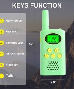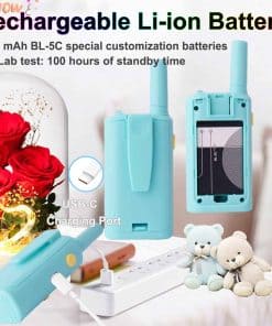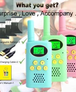 ¡Bienvenido a la tienda POKPOW! Estos walkie talkies para niños son una versión mejorada, con una distancia efectiva de comunicación de hasta 3 km (en campo abierto). Con una pantalla LCD brillante, linterna incorporada, conexión para auriculares, función de ahorro de batería y clip para cinturón. Es el mejor regalo de cumpleaños, Navidad para tus hijos. DESCRIPCIÓN 1. Distancia efectiva de comunicación: MÁX. 3 KM 2. Reducción automática de ruido 3. Mudo simulado en grupo 4. Potencia de transmisión: 0.5W (frecuencia de seguridad civil, sin interferencias ni radiación) 5. Selección de 10 tonos de llamada 6. Alimentado por: Batería de ion de litio recargable 7. Función de voz manos libres 8. Canales disponibles: 22 PAQUETE INCLUIDO 2 x Walkie Talkies 1 x Manual de usuario 2 Baterías de ion de litio 1 Cable de carga USB ADVERTENCIA Y PRECAUCIONES 1. No apto para niños menores de 3 años. 2. Mantener los walkie talkies secos y alejados de la humedad. 3. Usar un adaptador de buena calidad. GARANTÍA Ofrecemos 60 días de reemplazo o reembolso; 1 año de garantía (daños físicos y daños causados por un uso incorrecto excluidos)
