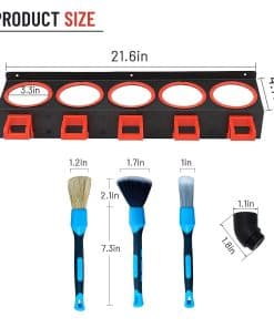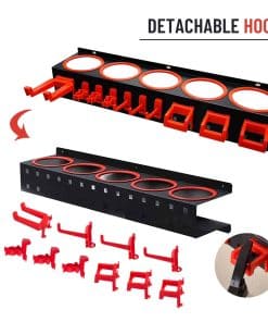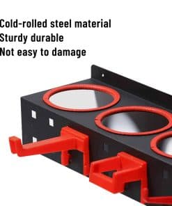 SKU: 1 Descripción Los organizadores de estantes de almacenamiento de botellas de spray y el lugar de almacenamiento para regaderas, botellas de spray, tarros de cera, etc. Satisfacer necesidades diversificadas. El estante con 5 agujeros y 5 ganchos colgantes de plástico. Todas las herramientas y accesorios están en buen estado en los detalles. Características – Color: Negro y rojo. – Tamaño: 55 x 12 x 8,5 cm / 21,7 x 4,7 x 3,3 pulgadas. – Material: Acero, plástico. – El estante de almacenamiento de botellas de spray está hecho de acero laminado en frío, duradero y difícil de dañar – Puede organizar varias botellas de spray y tarros de cera para mantener su garaje organizado. – Incluye estante de almacenamiento de 5 agujeros y 5 ganchos colgantes de plástico, que pueden contener fácilmente 10 botellas. – El diseño de apariencia es rojo y negro, simple y atractivo, perfecto para su garaje o cuarto de herramientas. – El borde del estante de almacenamiento de agujeros redondos está cubierto con cuero suave para evitar el desgaste de herramientas. Paquete incluido: porta botellas de spray 2