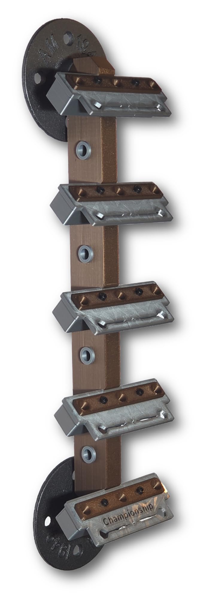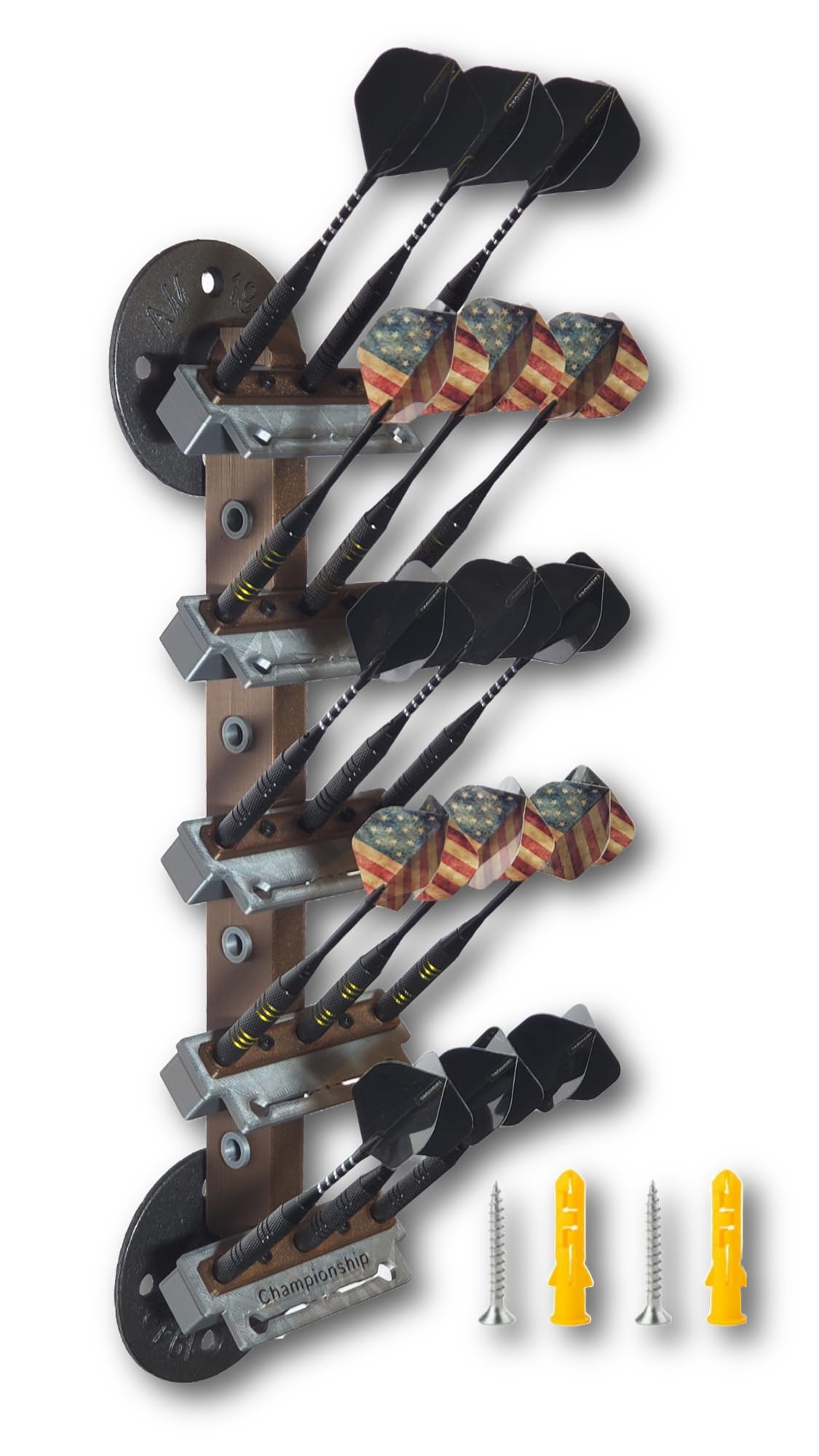 ¡Este singular porta dardos parece sacado de la era de la máquina! Sostiene cinco juegos de dardos de punta de acero en perfecta alineación. Las bridas de montaje son réplicas de bridas de hierro de tubería negra de 1949. El cuerpo principal, los travesaños y las placas de entrada de dardos están hechos de PLA impreso en 3D. Desarrollado y fabricado en Canadá.