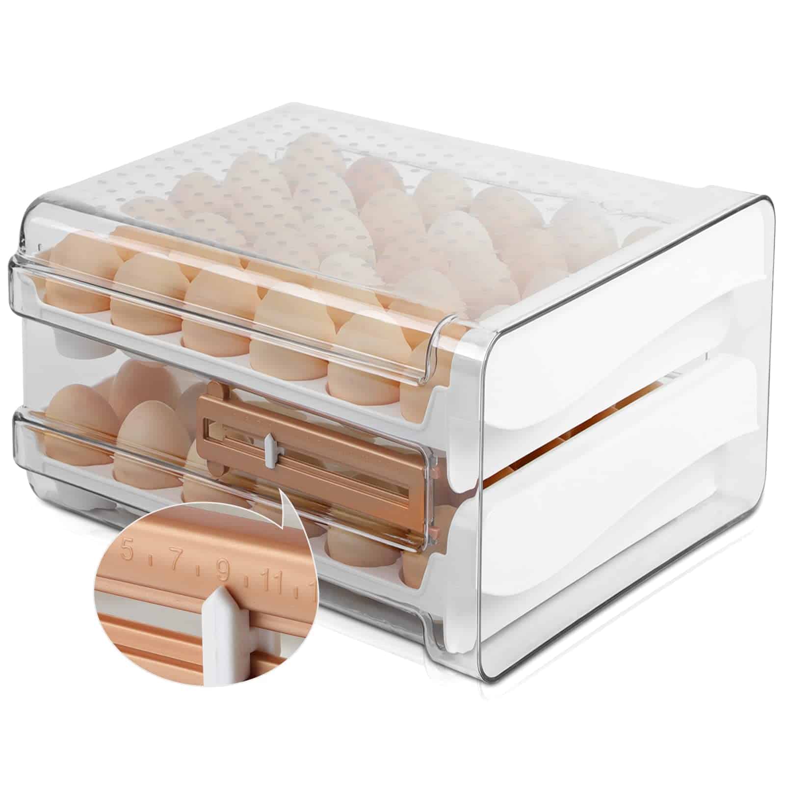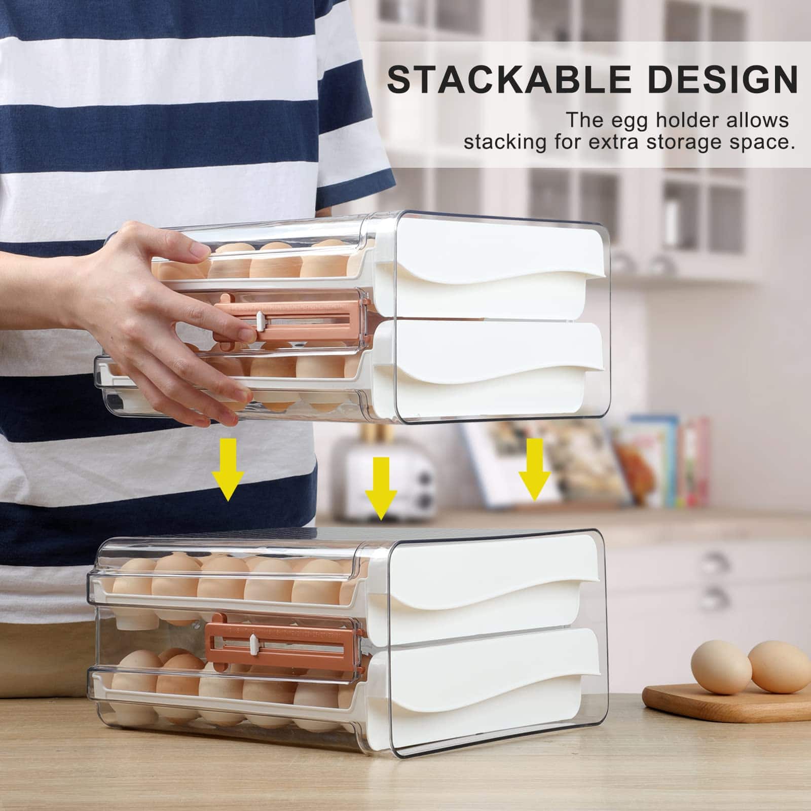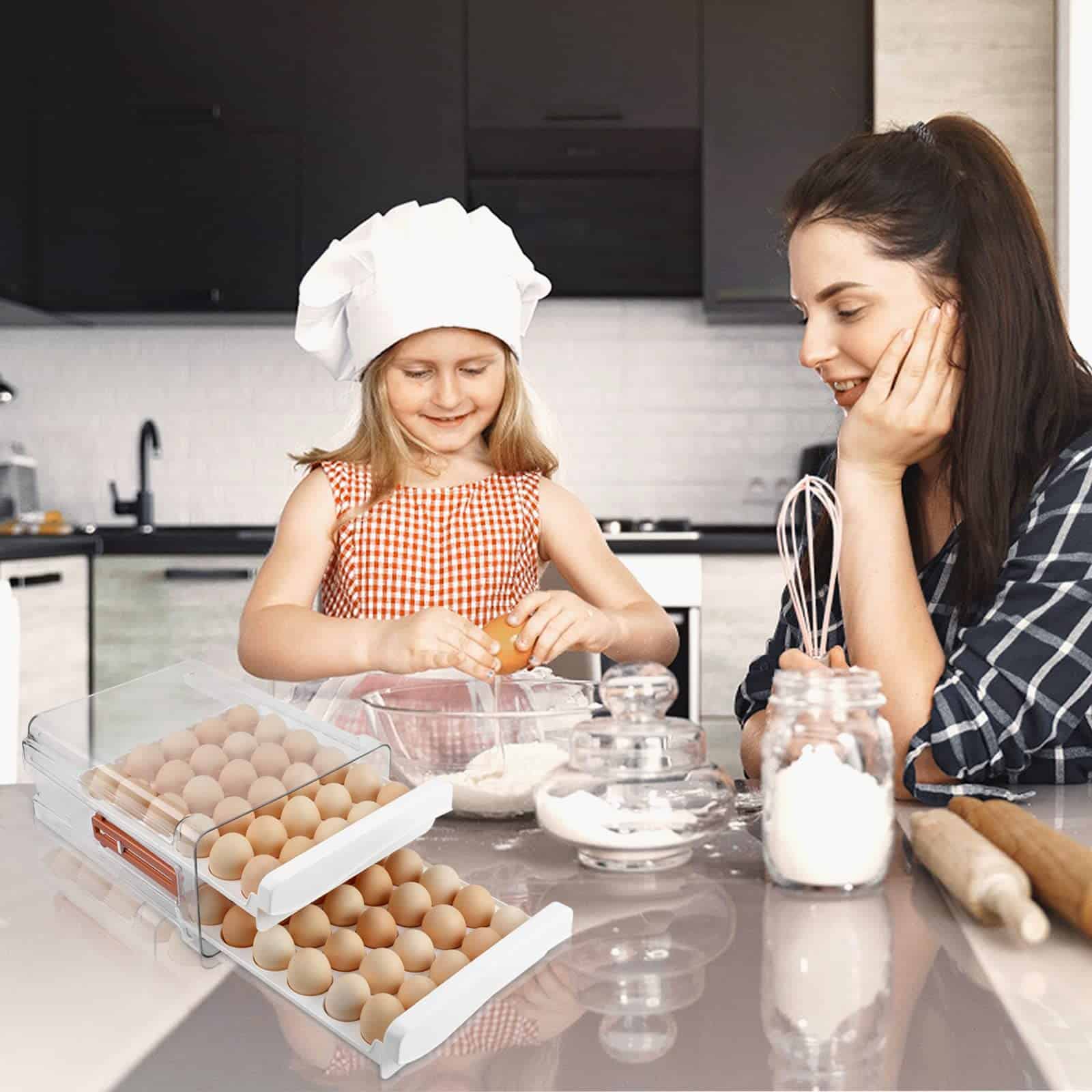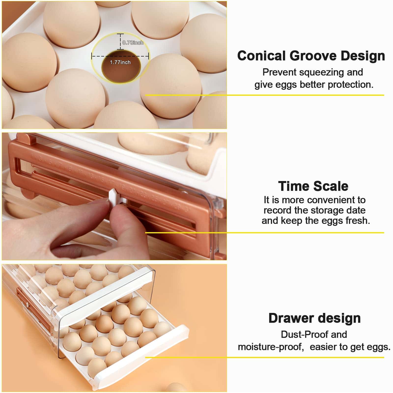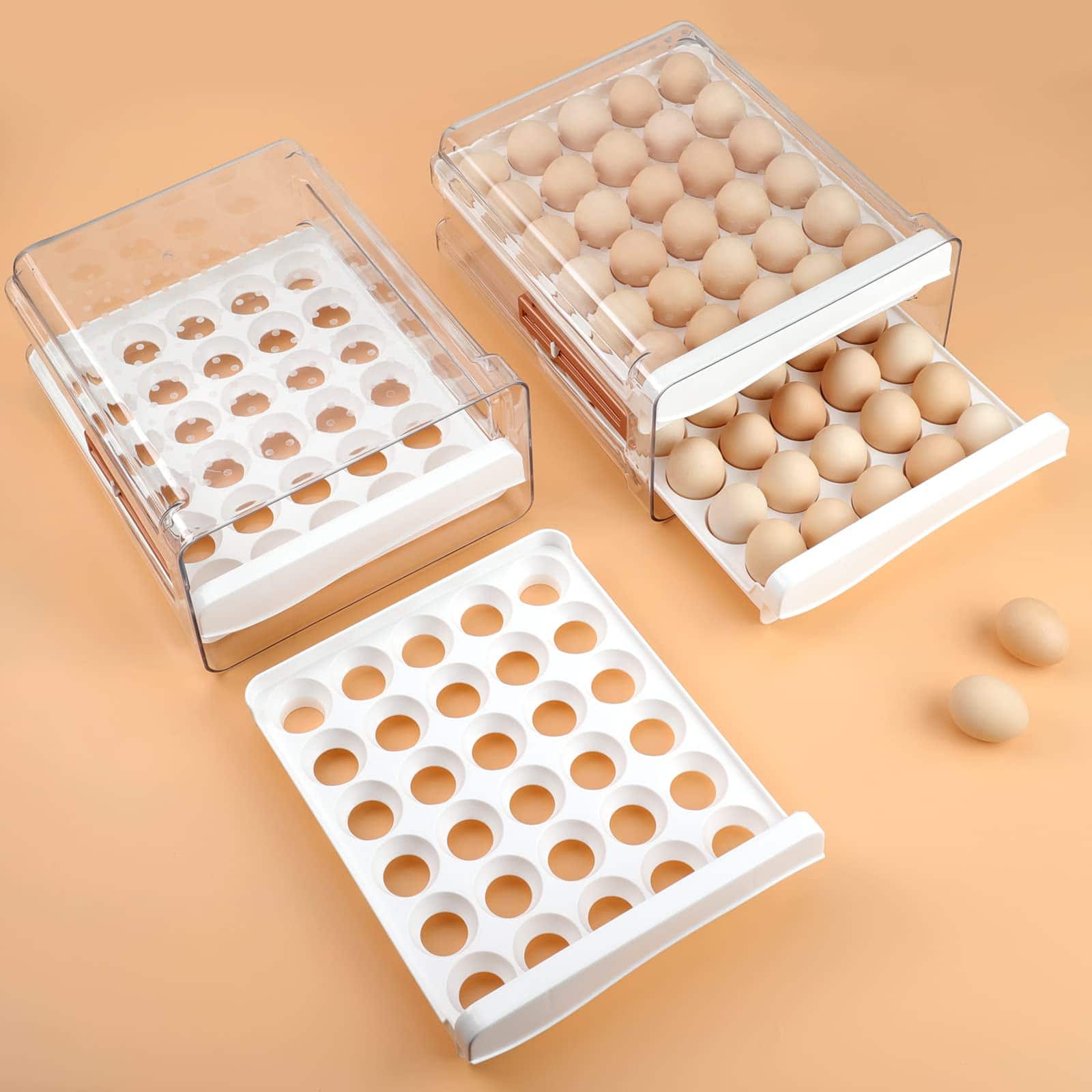 1. Diseño de dos capas: Cada cajón con una bandeja extraíble, una bandeja puede contener 30 huevos, cada ranura independiente puede evitar que los huevos se rompan y choquen.