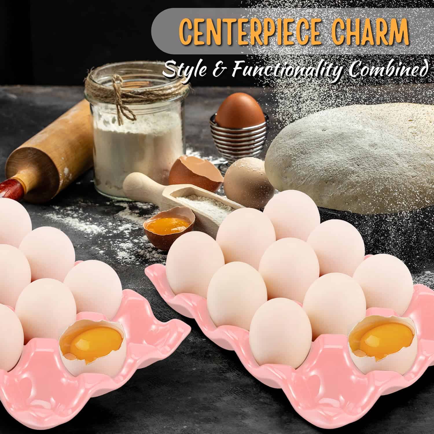 Contenido del paquete: 1 x Bandeja de huevos de cerámica de 12 tazas – Porta huevos de porcelana de docena para guardar recipientes, organizador de servidores decorativos de plato de servir para exhibidores de refrigeradores, 2 paquetes (rosa)