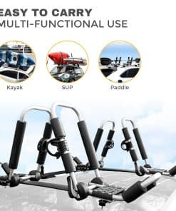 Especificaciones: Material: Aleación de Aluminio de Grado Aeronáutico. Capacidad de Carga Total: 160 lbs. / 72 kg por par. Acomoda Kayaks de hasta 42» de ancho. Dimensiones del Producto: Como se muestra en la imagen. Peso: 8.8 lbs. Paquete Incluye: 1 par (2 racks), 2 correas, 1 kit de instalación. Características: Porta-kayak de estilo J premium perfecto para transportar tu kayak de forma más fácil y segura. El hardware de montaje se ajusta a rieles transversales redondos, cuadrados y de la mayoría de las formas ovaladas instalados en fábrica de forma rápida y sencilla. Fabricado con aleaciones de aluminio de grado aeronáutico anodizado de alta calidad, ligero, duradero y resistente a la corrosión. Acolchados de goma gruesos y resistentes a todas las condiciones climáticas y soportes acolchados verticales que pueden evitar que el kayak se roce y se dañe de manera efectiva. Montaje o transferencia a otro vehículo en minutos sin necesidad de herramientas adicionales. Cada par de soportes incluye dos soportes de remo nativos, que son el accesorio perfecto que necesitas para ayudarte a posicionar tus remos mientras transportas kayaks. Lista de Paquetes: Rack de techo para kayak: 2 unidades. Adaptadores universales: 2 unidades. Pernos de portador M8-1,25: 4 unidades. Tuercas de perilla M8-1,25: 4 unidades. Correas de 25 X 2800 mm: 2 unidades.