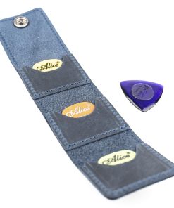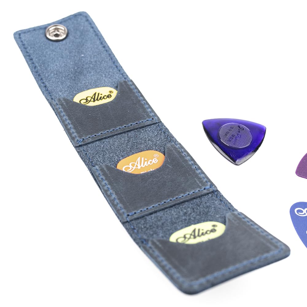El estuche está equipado con un cierre de botón cómodo y de alta calidad, y contiene tres ranuras donde puedes guardar hasta cinco púas de guitarra de diferentes tamaños.