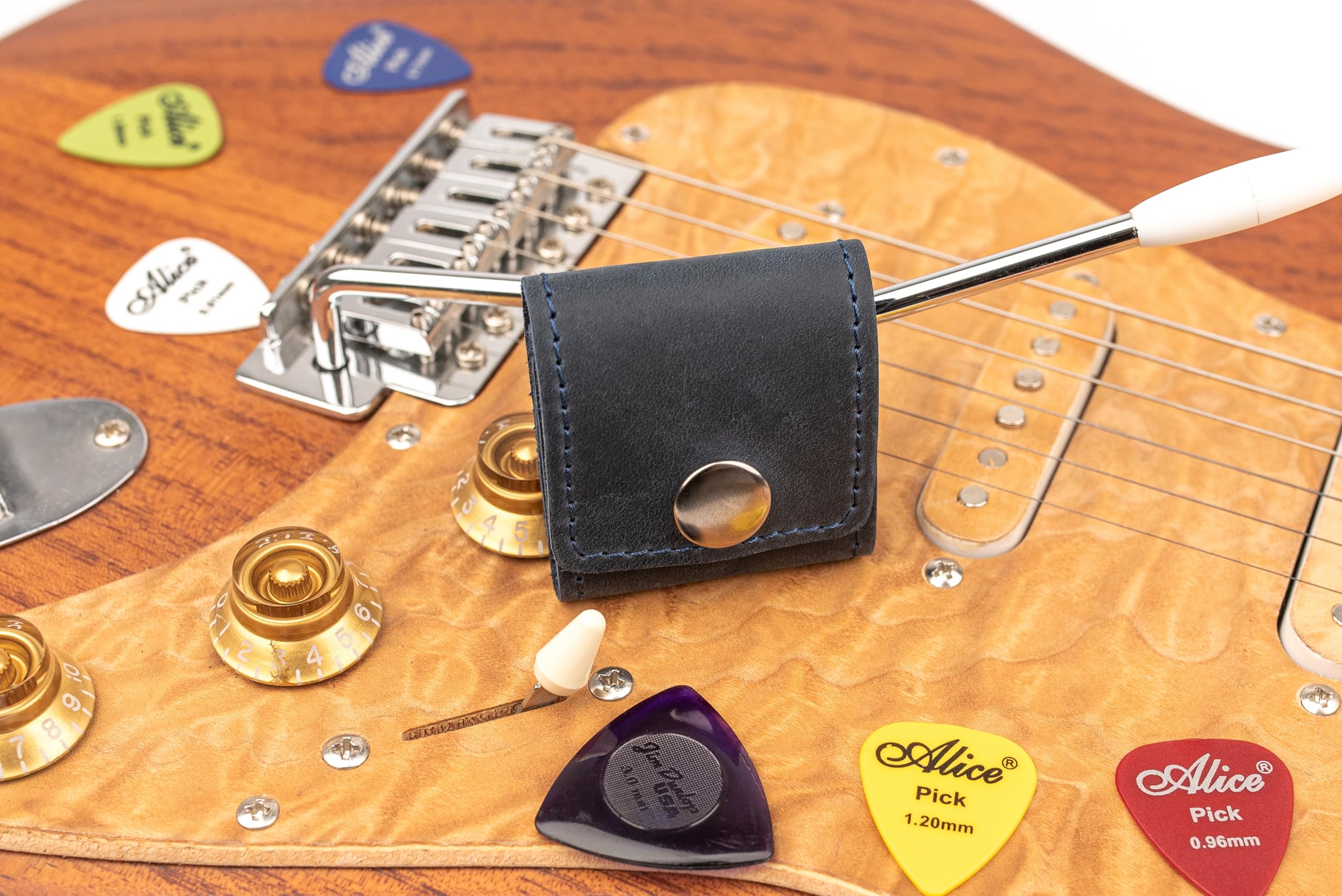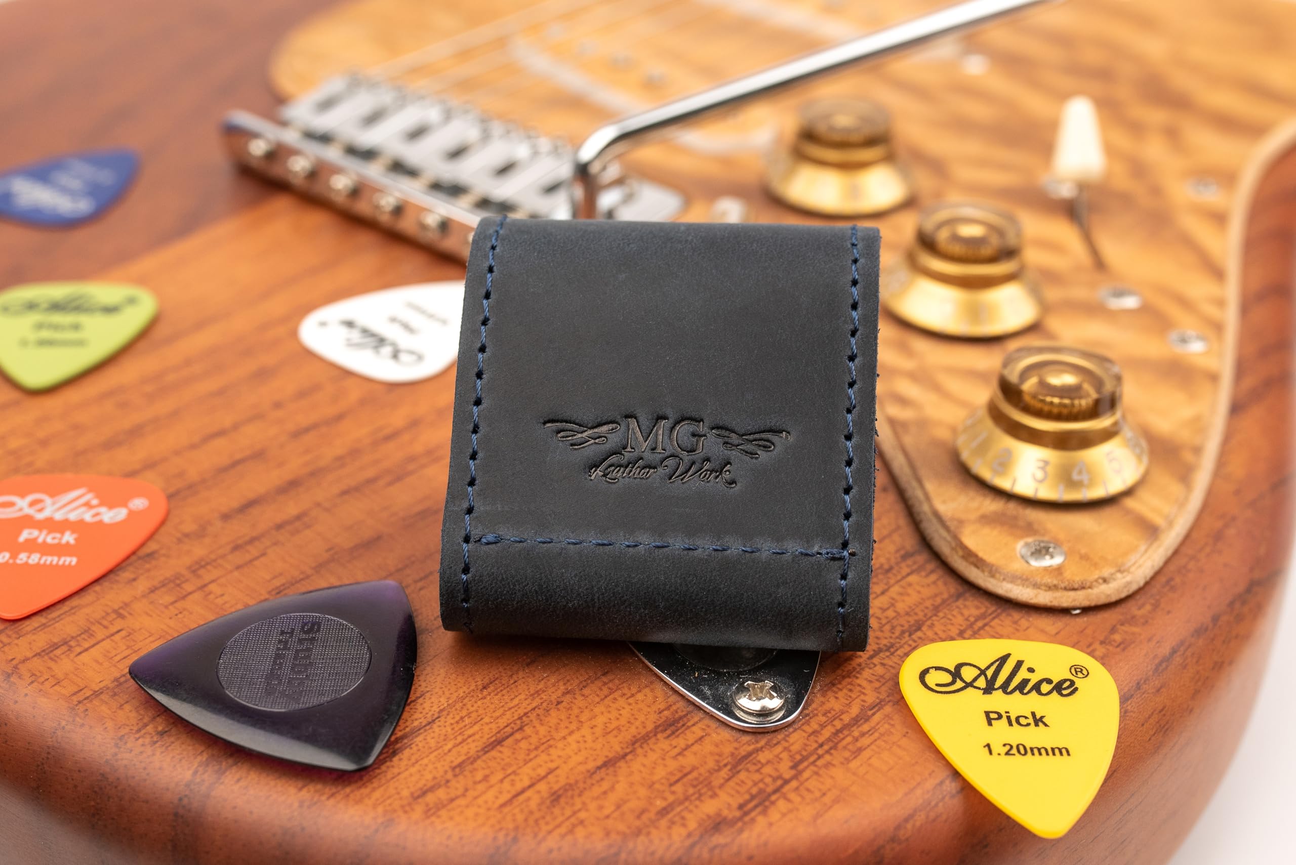 1. MATERIAL DE CUERO PREMIUM: Hecho de cuero genuino, garantizando durabilidad y un aspecto elegante mientras mantiene seguras y protegidas tus púas de guitarra.