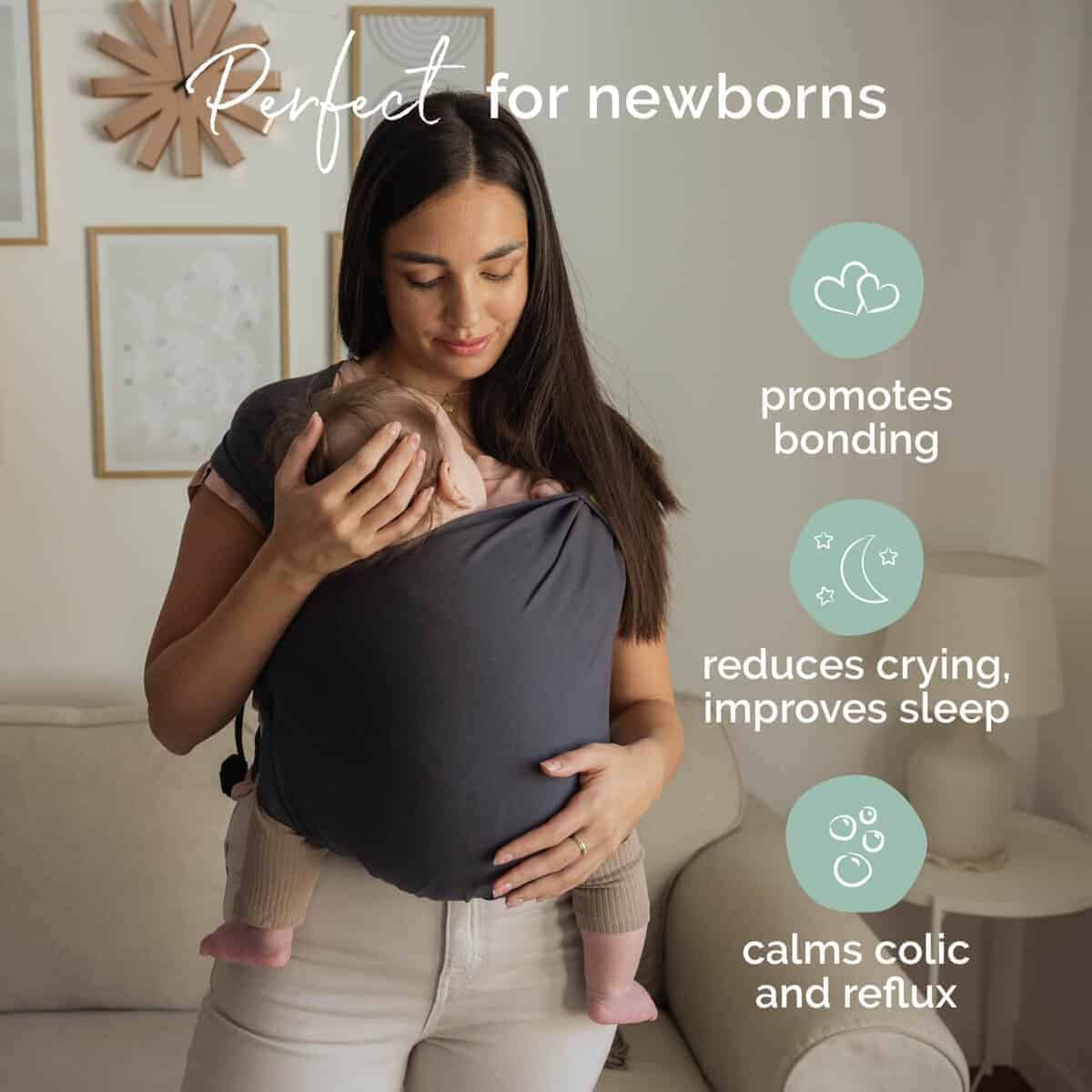 2. Envoltura para recién nacidos sin ataduras: ¡Experimenta un porteo sin esfuerzo desde el primer día! ¡Lleva a tu recién nacido hasta la primera infancia (7-35 lbs) con un portabebés híbrido que combina la facilidad de un portabebés con la suavidad ajustada de una envoltura de bebé! ¡No es necesario atar nada!