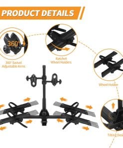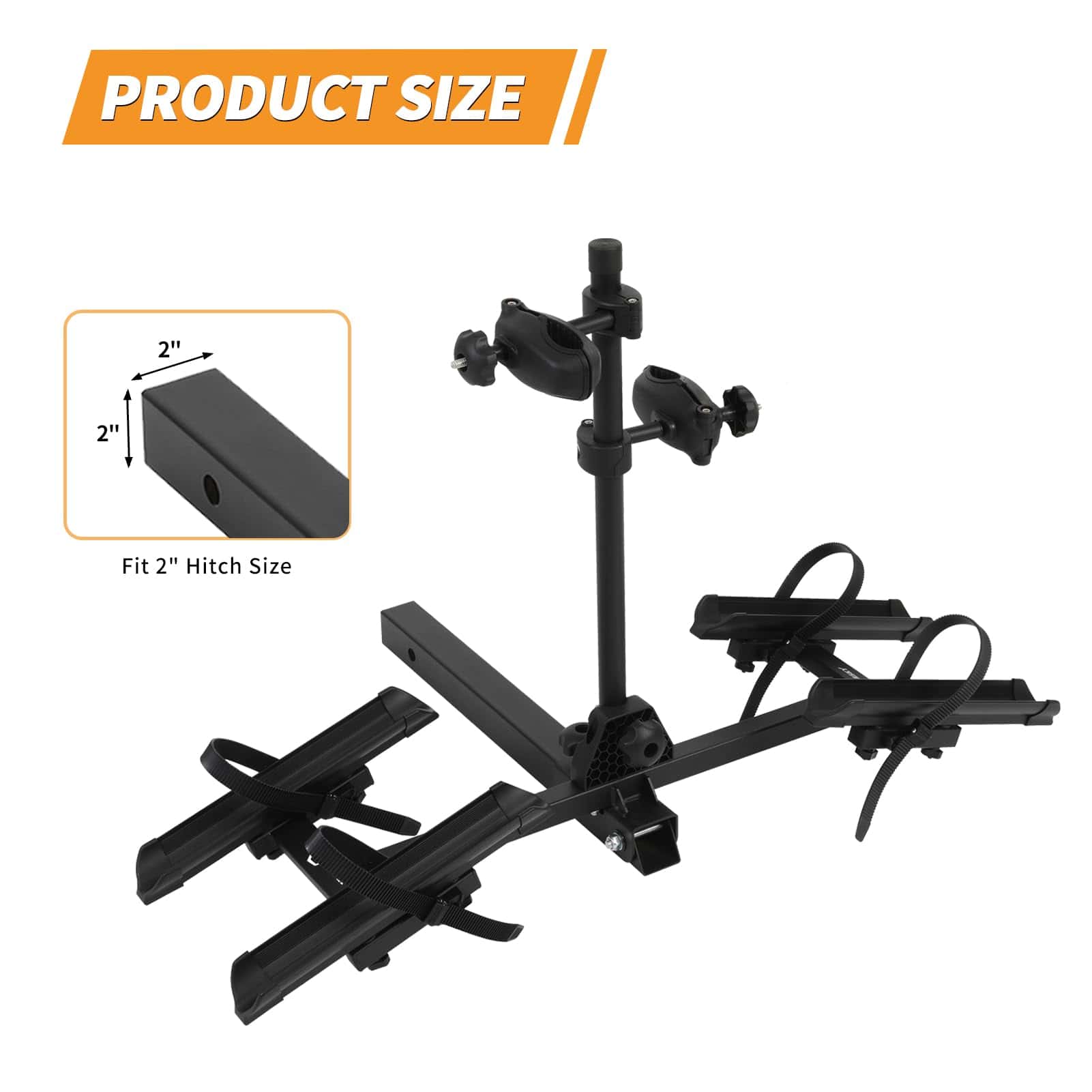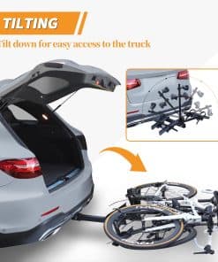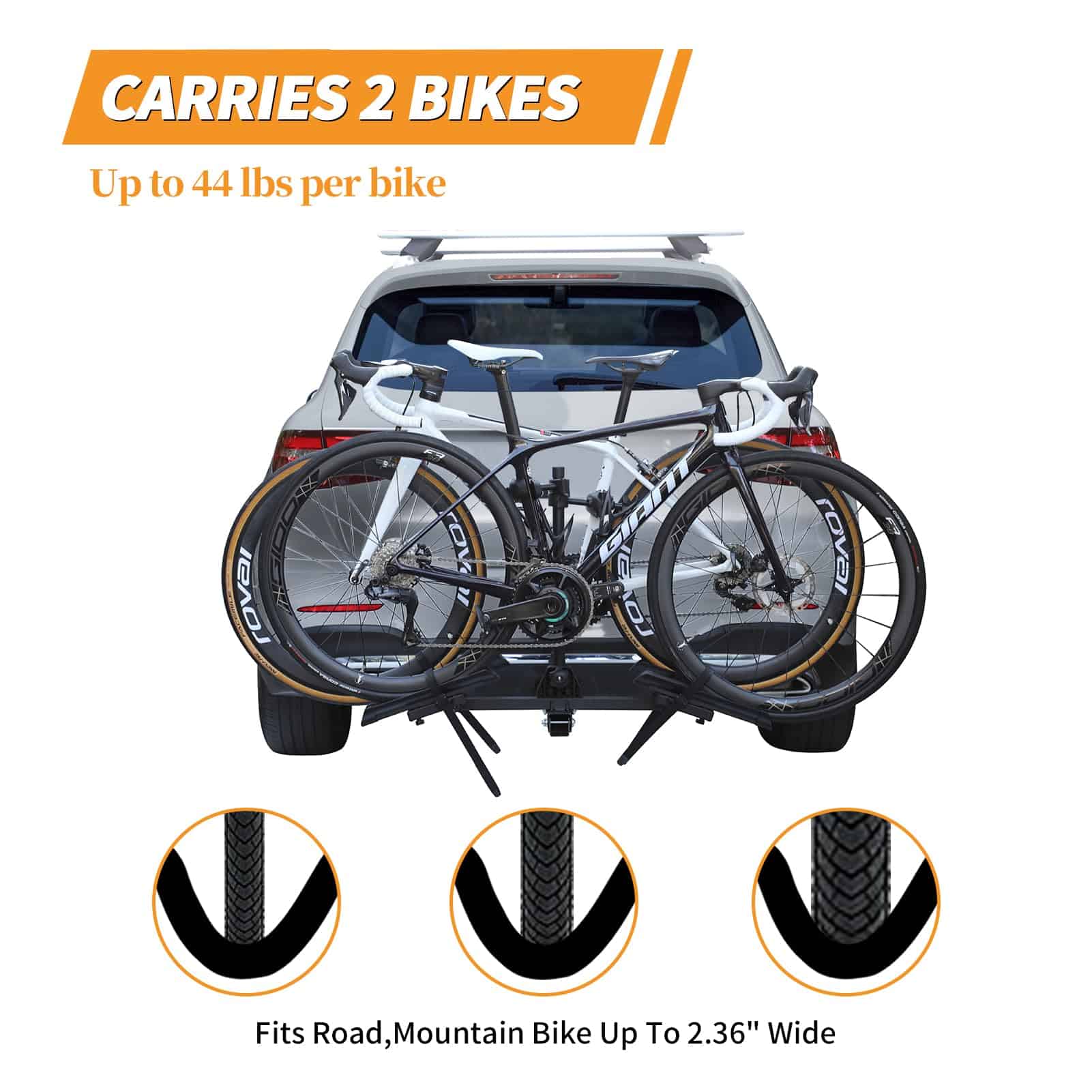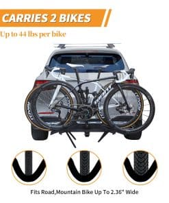 1. Se adapta a receptores de 2″, transporta hasta 2 bicicletas, hasta 44 lb por bicicleta. Se adapta a neumáticos de hasta 2.36″ de ancho, distancia entre ejes de hasta 29 pulgadas de bicicletas de carretera, montaña u otros estilos.
