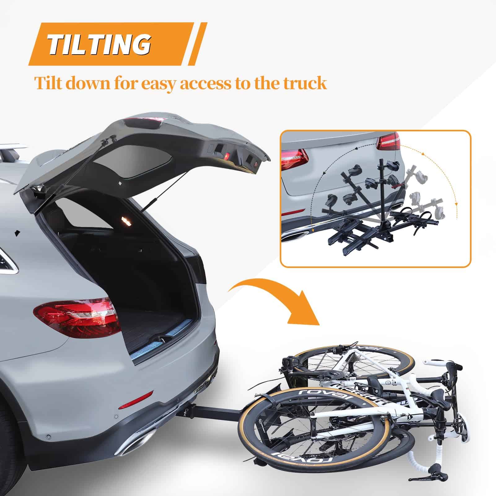3. Inclinable y plegable Este portabicicletas para coche se puede inclinar hacia abajo para acceder fácilmente al maletero y plegarse para ahorrar espacio cuando no se use girando los botones.