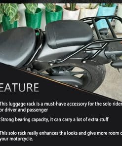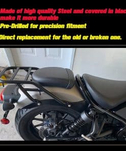 Portaequipajes trasero para motocicleta TAZGANTAX, Estante de portaequipajes trasero de acero negro compatible con Ho-nda CMX Rebel 300/500 2017 2018 2019 2020 2021 2022 2023 2024. Este es un nuevo artículo de reemplazo de mercado secundario, en lugar de su unidad defectuosa/antigua. NO ES LA PIEZA OEM. Confirme el año exacto y el modelo exacto de su motocicleta antes de realizar el pedido. El portaequipajes para Rebel 500 está hecho de acero de alta resistencia, la estructura sólida lo hace duradero para un rendimiento duradero, no es fácil de romper. El proceso de recubrimiento en polvo hace que la superficie sea más suave, resistente al óxido y resistente al agua. Cantidad: 1 pieza de portaequipajes trasero para Rebel 300, viene con herrajes de montaje para una instalación fácil. El portaequipajes le proporciona más espacio de almacenamiento, le permite llevar más artículos mientras conduce y brinda un soporte más seguro para los pasajeros traseros. Asegurar la máxima rigidez y una seguridad muy alta. Diseño robusto y elegante; se puede usar como almacenamiento de equipaje o reposabrazos para pasajeros, lo que realmente puede satisfacer sus necesidades. Fácil de instalar y operar, conveniente de usar. Una herramienta práctica que necesitará. Color negro, hace que su motocicleta sea más destacada. Empaque perfecto y garantía de seguridad: tenemos mucha confianza en nuestros productos y los empaquetamos muy bien, por lo que generalmente recibirá su pedido en buenas condiciones. No dude en contactarnos si tiene alguna pregunta. Nuestro confiable servicio al cliente le responderá en un plazo de 24 horas y le ofrecerá una solución adecuada.