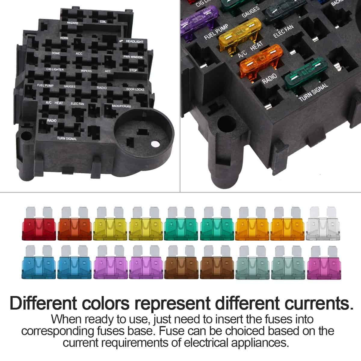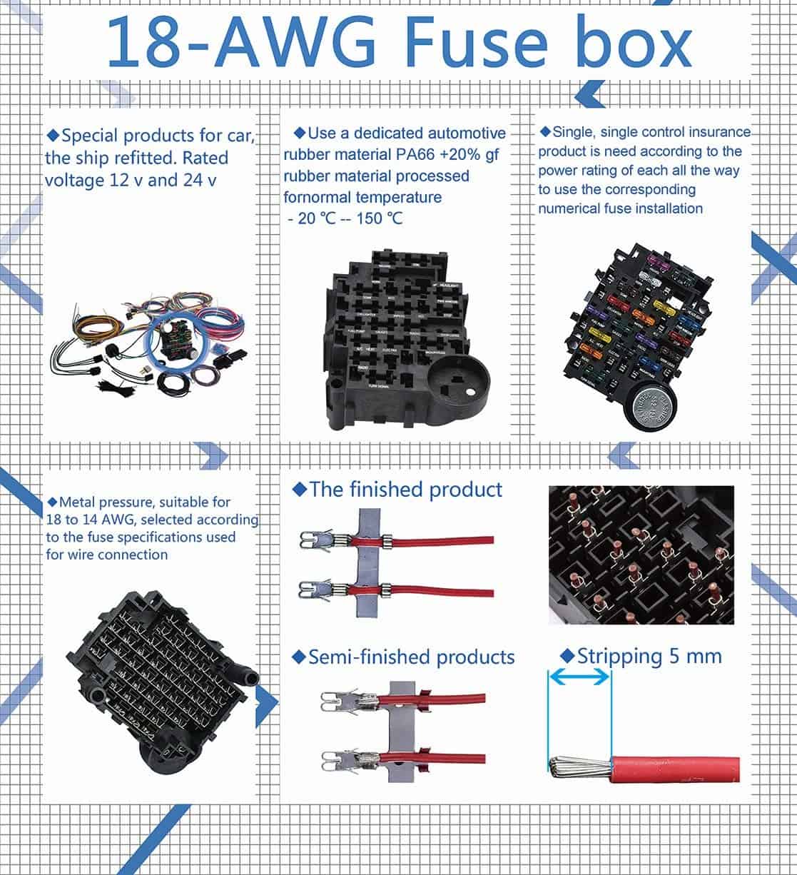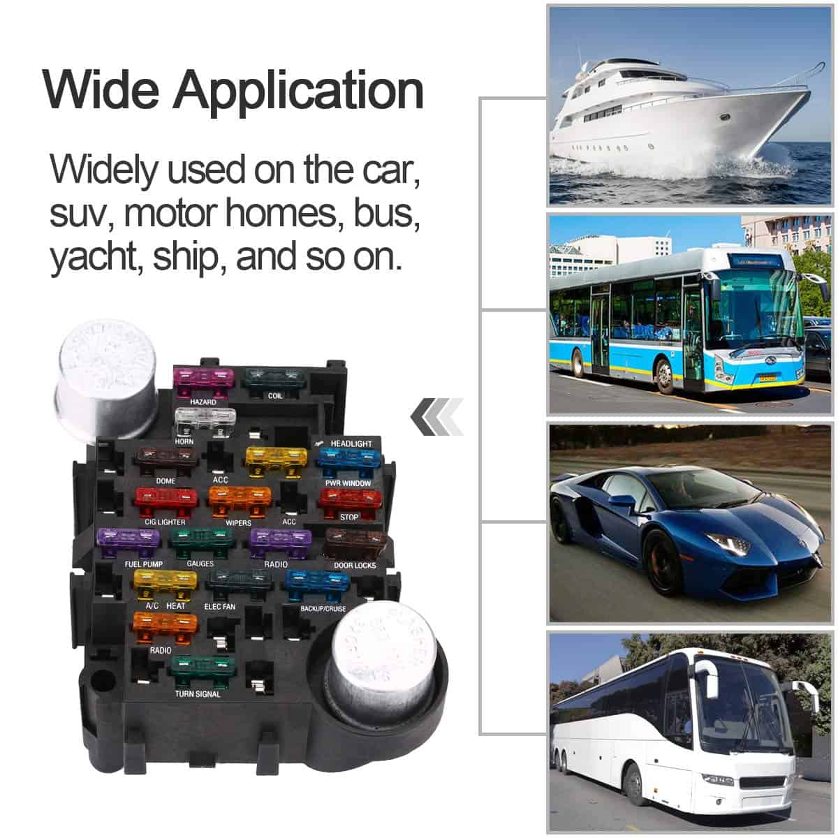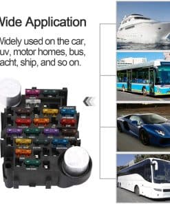 4. Uso versátil: Este portafusibles de 18 circuitos es ampliamente utilizado en automóviles, autobuses, tanques, barcos, marinos, camiones, SUV, yates, vehículos recreativos, barcos, etc.