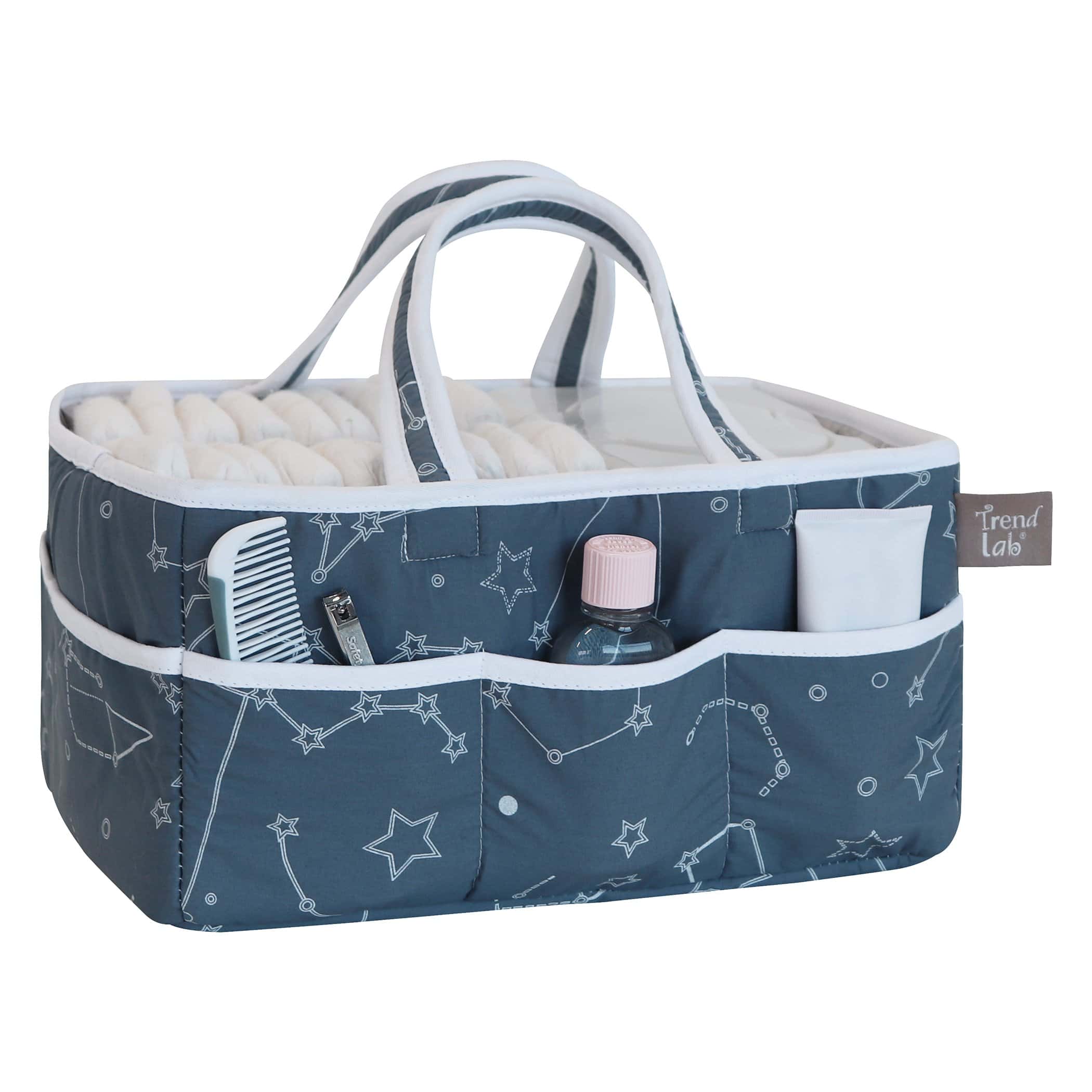 Agregue organización a cualquier área de su hogar con este portaobjetos portátil Galaxy de Trend Lab. Perfecto para tocadores y mesas de cambio, este portaobjetos ligeramente acolchado tiene 8 bolsillos externos y un separador «T» extraíble para máxima versatilidad. El cuerpo y las asas son azul oscuro con un estampado de constelación blanco con un forro coordinado de estampado de nave espacial gris tonal y ribete blanco sólido. Mantenga pañales, toallitas y otras necesidades ordenadas mientras se desplaza de una habitación a otra. El portaobjetos también funciona como organizador para manualidades, picnics, suministros para mascotas, etc. Medidas de 12 in x 6 in x 8 in.
