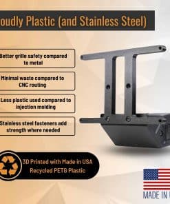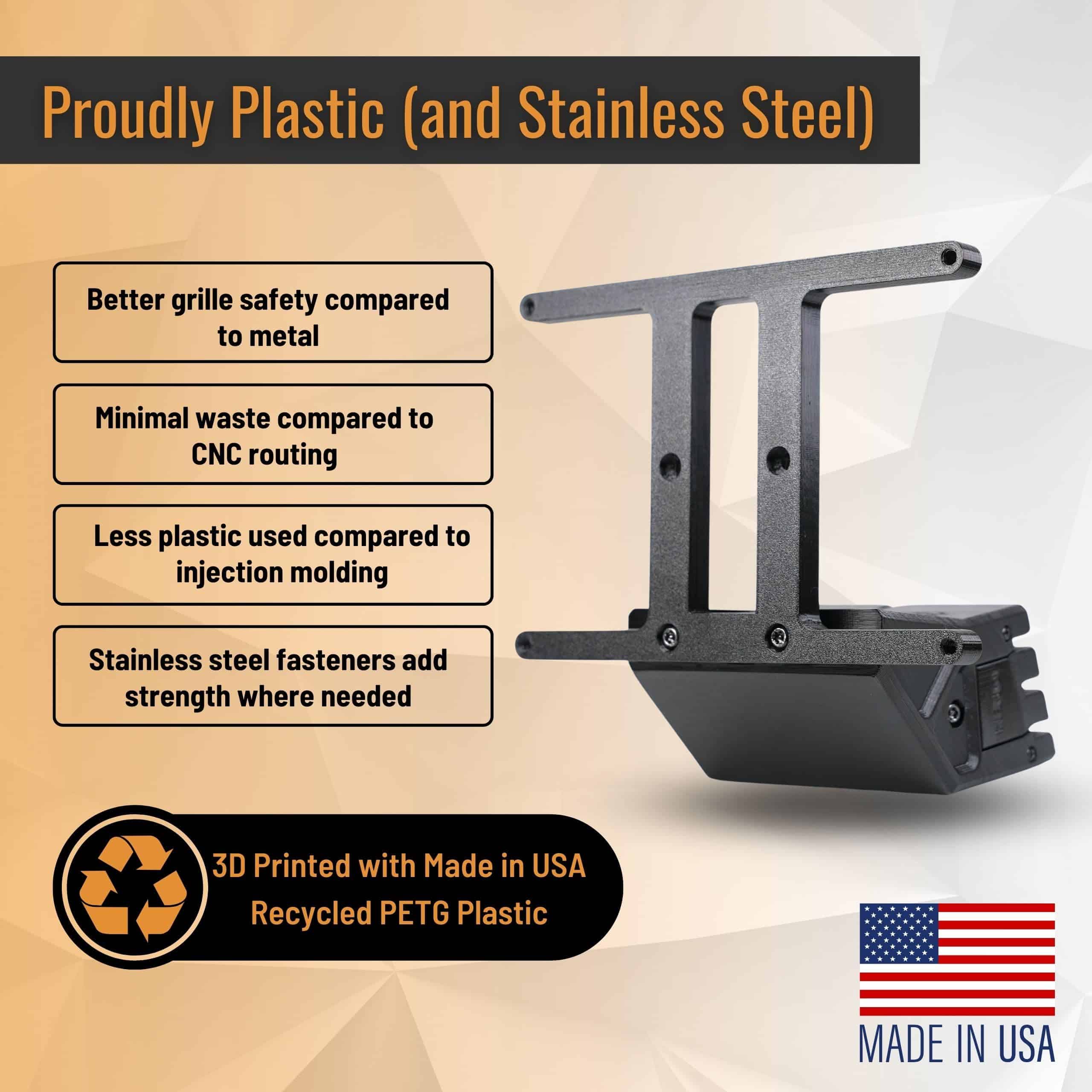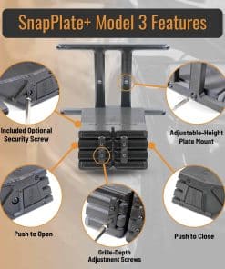 Para instalar SnapPlate: Presiona el botón OPEN para girar las trancas al abrirse Alinéalo con el centro de la parrilla Conéctalo Presiona el botón CLOSE para girar las trancas al cerrarse (los imanes internos lo mantienen cerrado) Listo Opcionalmente, si deseas seguridad adicional, utiliza el destornillador incluido para apretar el tornillo de seguridad negro en el lado derecho