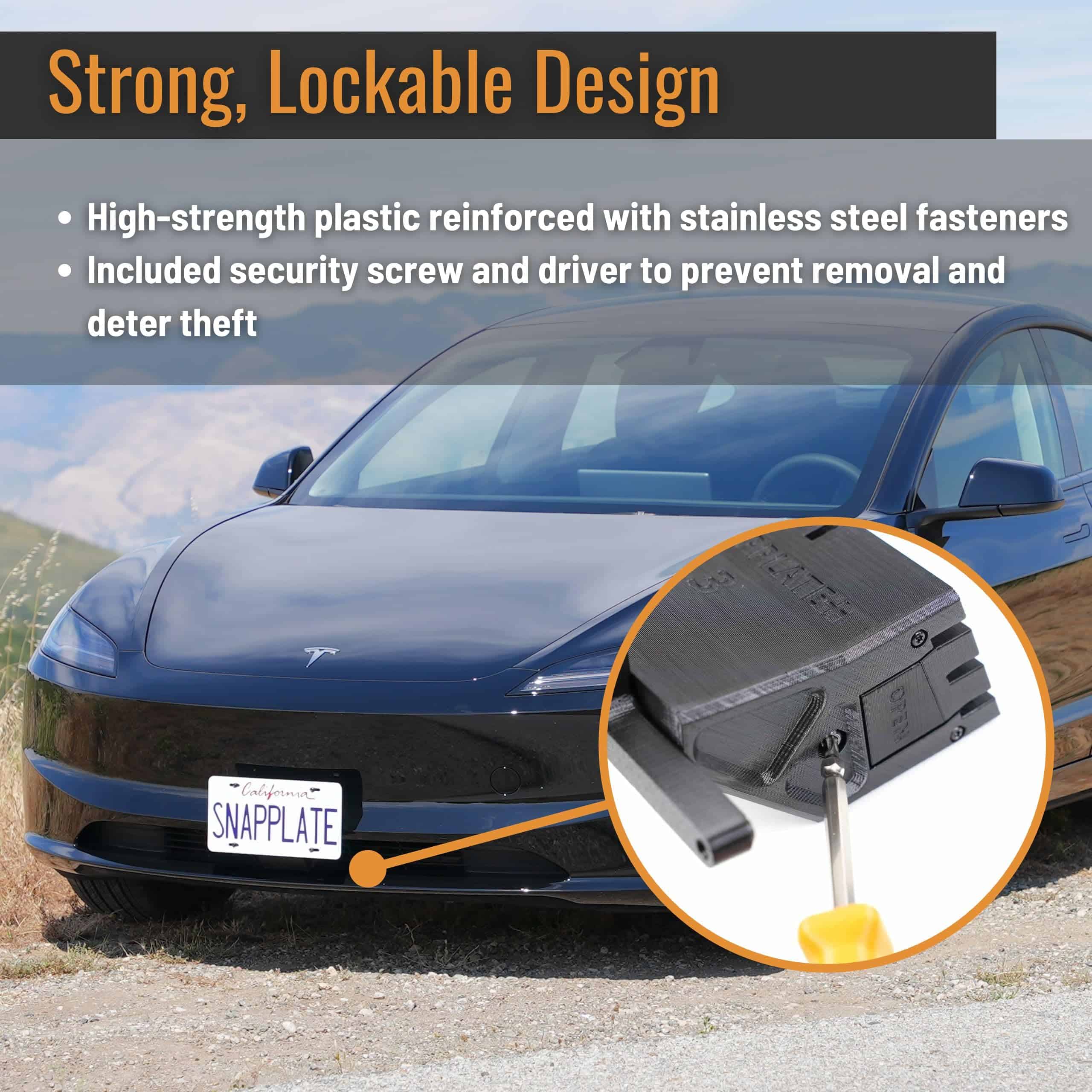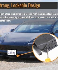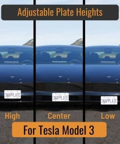 SnapPlate+ son soportes de placa delantera desmontables optimizados en resistencia que se instalan y remueven por completo en segundos. El diseño limpio y minimalista se integra perfectamente con el frente de Tesla cuando está instalado, y no deja ninguna pieza de montaje antiestética al retirarlo. El soporte de placa de tercera generación es ajustable en altura con posiciones de montaje alta, centro y baja para adaptarse a tu gusto.