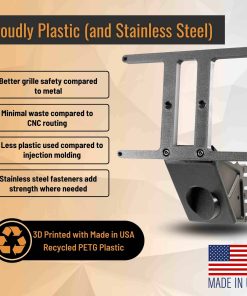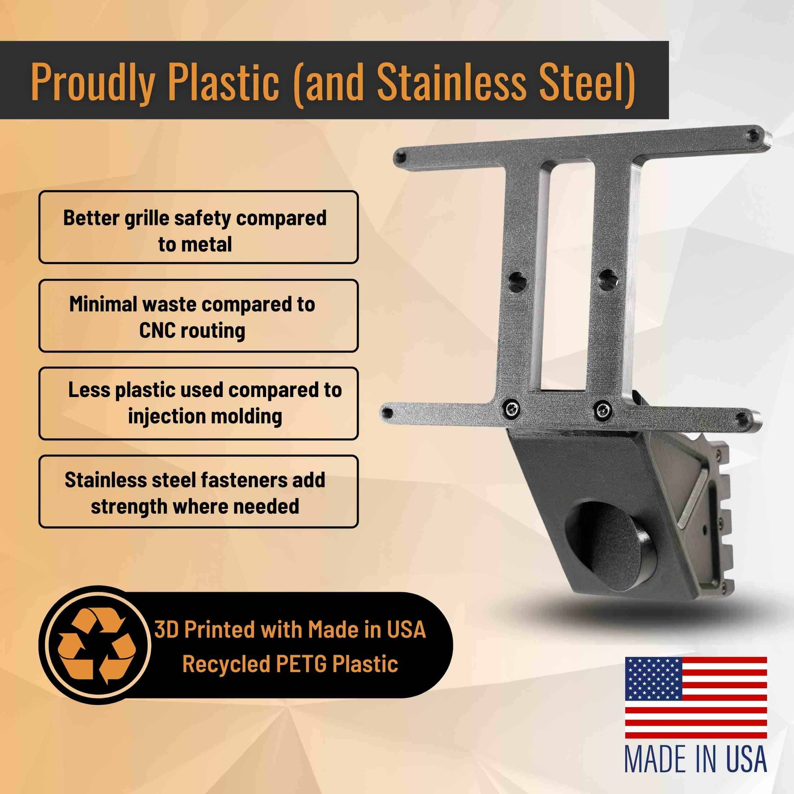 4. FABRICACIÓN RESPONSABLE – Impreso en 3D en California con plástico reciclado fabricado en EE. UU. para una mayor seguridad del vehículo en comparación con el metal y para reducir los desechos y el uso de plástico en comparación con el enrutamiento CNC y la inyección de plástico.