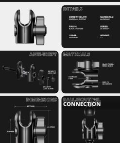 4. PERILLA ANTIRROBO OPCIONAL: (PATENTE PENDIENTE) Este brazo, aunque no siempre necesario, cuenta con características antirrobo opcionales. Esto puede (A) ayudar a prevenir situaciones de arrebato en tu Can-Am, motocicleta, SXS u otros entornos similares. (B) La bola no puede salirse de la toma si se aprieta correctamente.