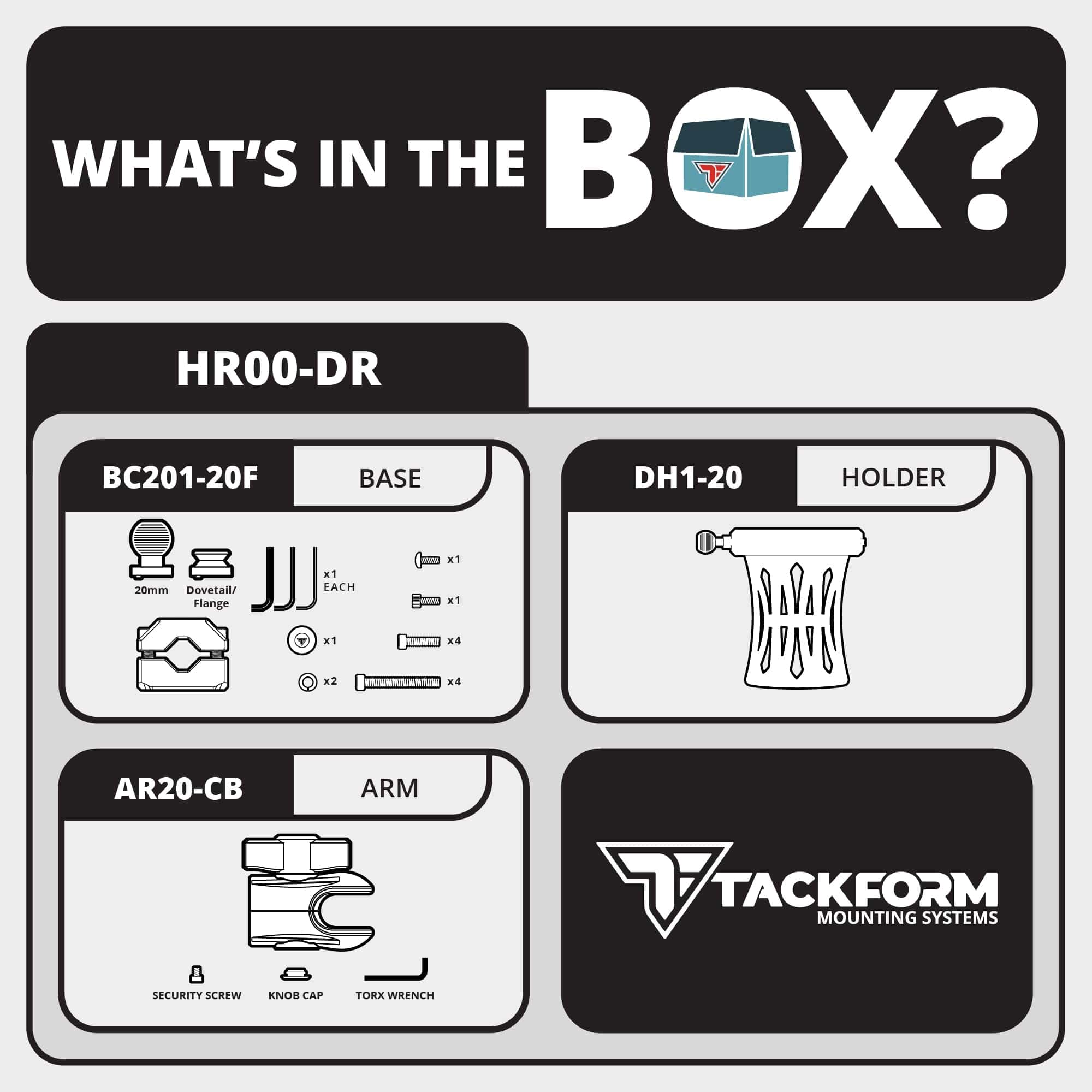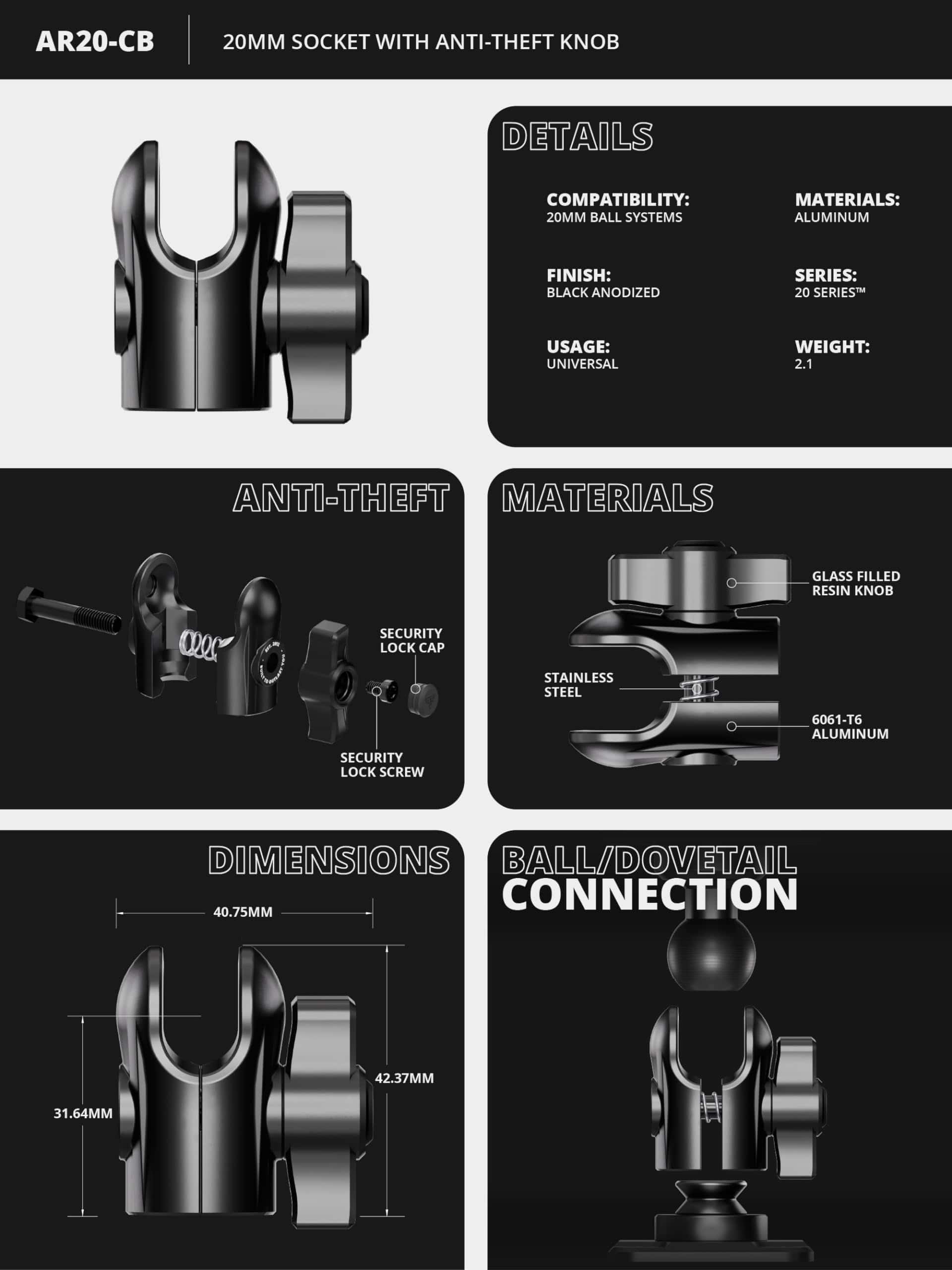 5. SERIE 20 DE TACKFORM: Diseñada específicamente para ser compatible con la Plataforma Serie 20 de Tackform, que gira en torno al sistema de bola y toma de 20 mm. Aunque compatible con otros productos de 20 mm, nuestras piezas destacan por su durabilidad probada y sus capacidades de carga ingenierizadas, con un factor de seguridad no garantizado por otros fabricantes. Ten en cuenta: No apto para bolas de 25.4 mm / 1″ / tamaño B.