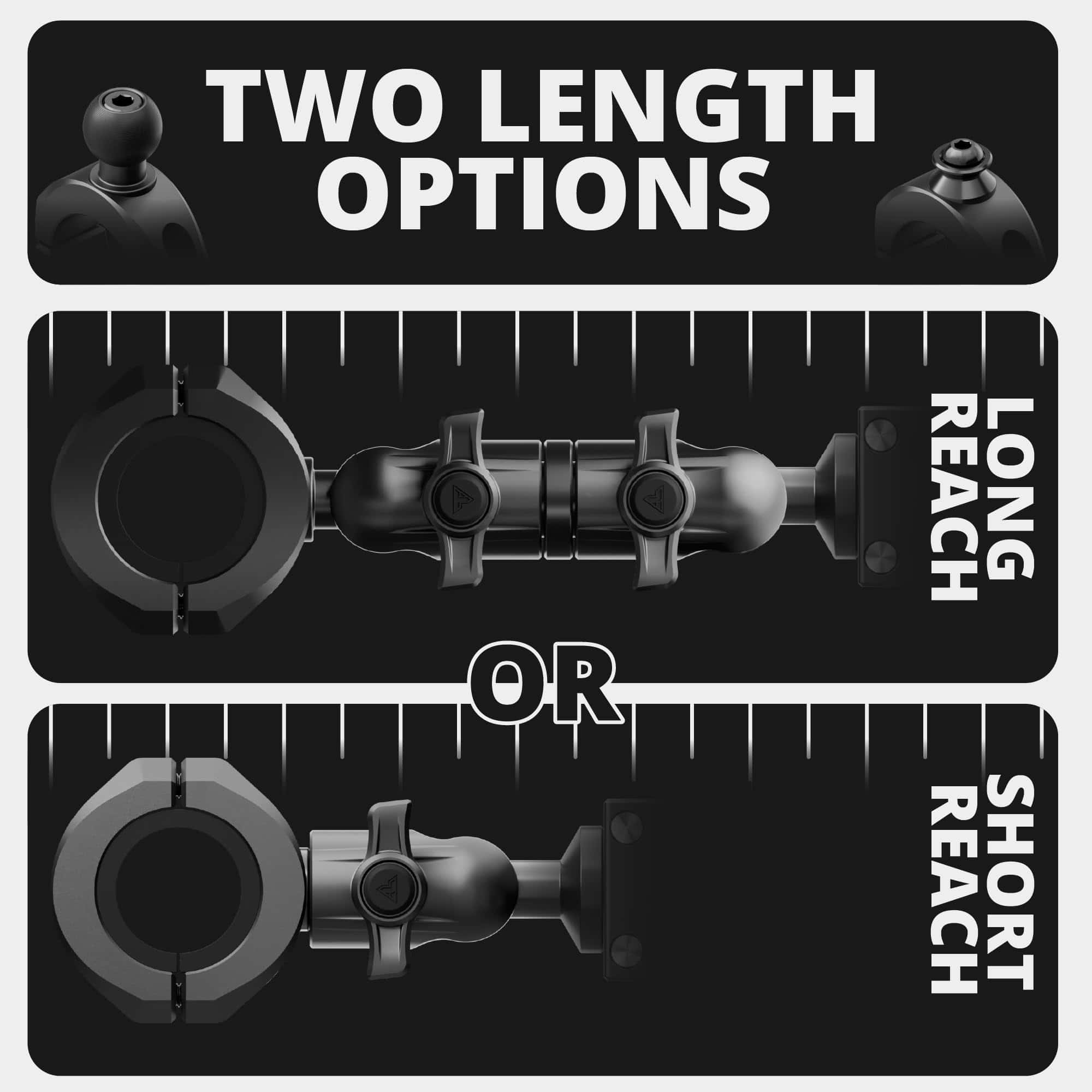 8. COMPATIBILIDAD DE INTERCAMBIO DE COLORES: Tackform ofrece una amplia gama de perillas de aluminio anodizado sólido. Este brazo DuraLock es compatible con las perillas DuraLock de Tackform, lo que le permite personalizar su configuración para que coincida con su vehículo. Se incluyen perillas negras.