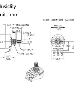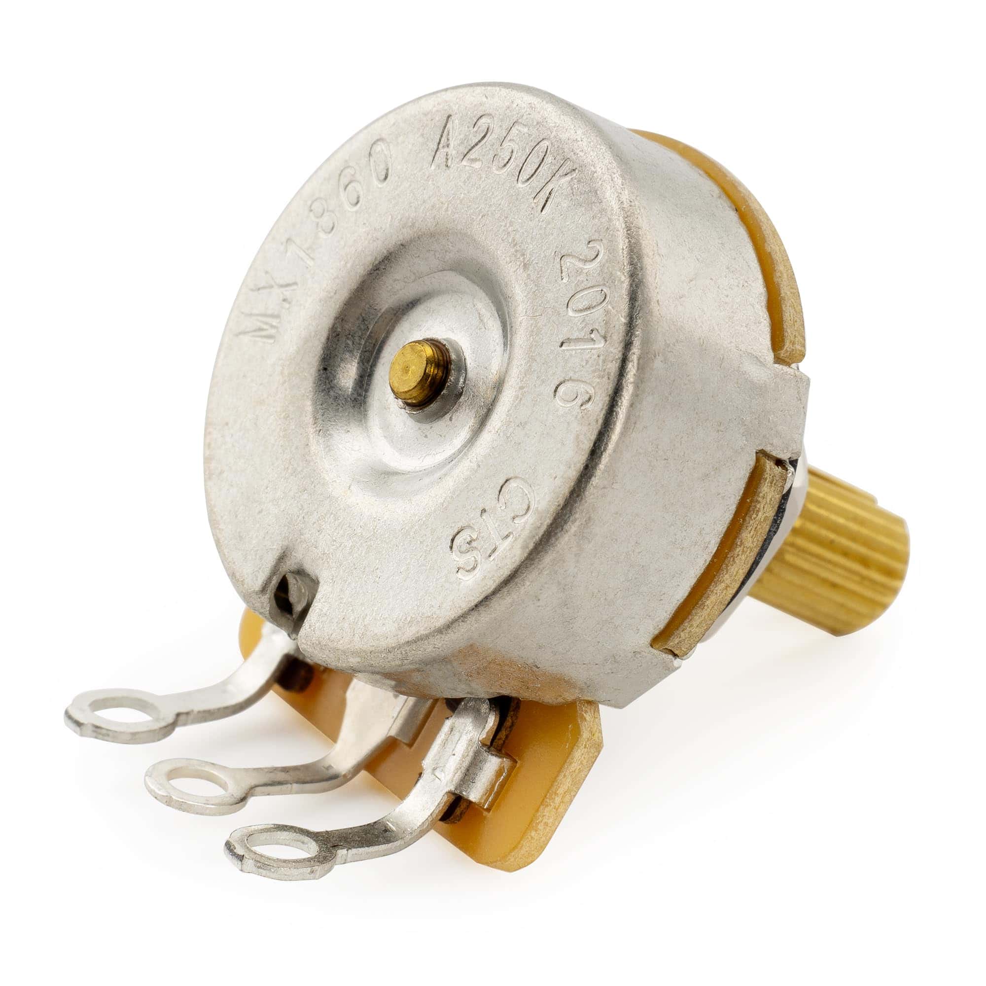 Potenciómetros CTS 450G A250K Eje Dividido Corto de latón 1/4 pulgadas 10% de tasa de audio para Guitarra Eléctrica Bajo (Juego de 3). Los potenciómetros CTS son controles de guitarra ampliamente utilizados que se ajustan a la mayoría de guitarras eléctricas y bajos de Estados Unidos como ST, TL, PB, JB. Son parte de la serie insignia de guitarras CTS 450G con especificaciones personalizadas de Musiclily. Estos potenciómetros vienen con ejes divididos finos de 24 estrías de tamaño imperial, lo que les permite ser compatibles con perillas de guitarra hechas en Estados Unidos. Tienen una tasa de audio, resistencia de 250K y tolerancia del 10%. El eje y casquillo están hechos de latón con parte trasera de estilo vintage. Estos potenciómetros cuentan con bajo ruido, construcción robusta, lubricante antiestático propio, sensación suave, reducción del tambaleo del eje y cubierta soldable estañada. La resistencia de 250K se utiliza generalmente para pastillas de bobina simple, desviando algunas de las altas frecuencias a tierra, lo que proporciona un tono más cálido que los de 500K. El paquete incluye 3 potenciómetros, arandelas de bloqueo, arandelas y tuercas.