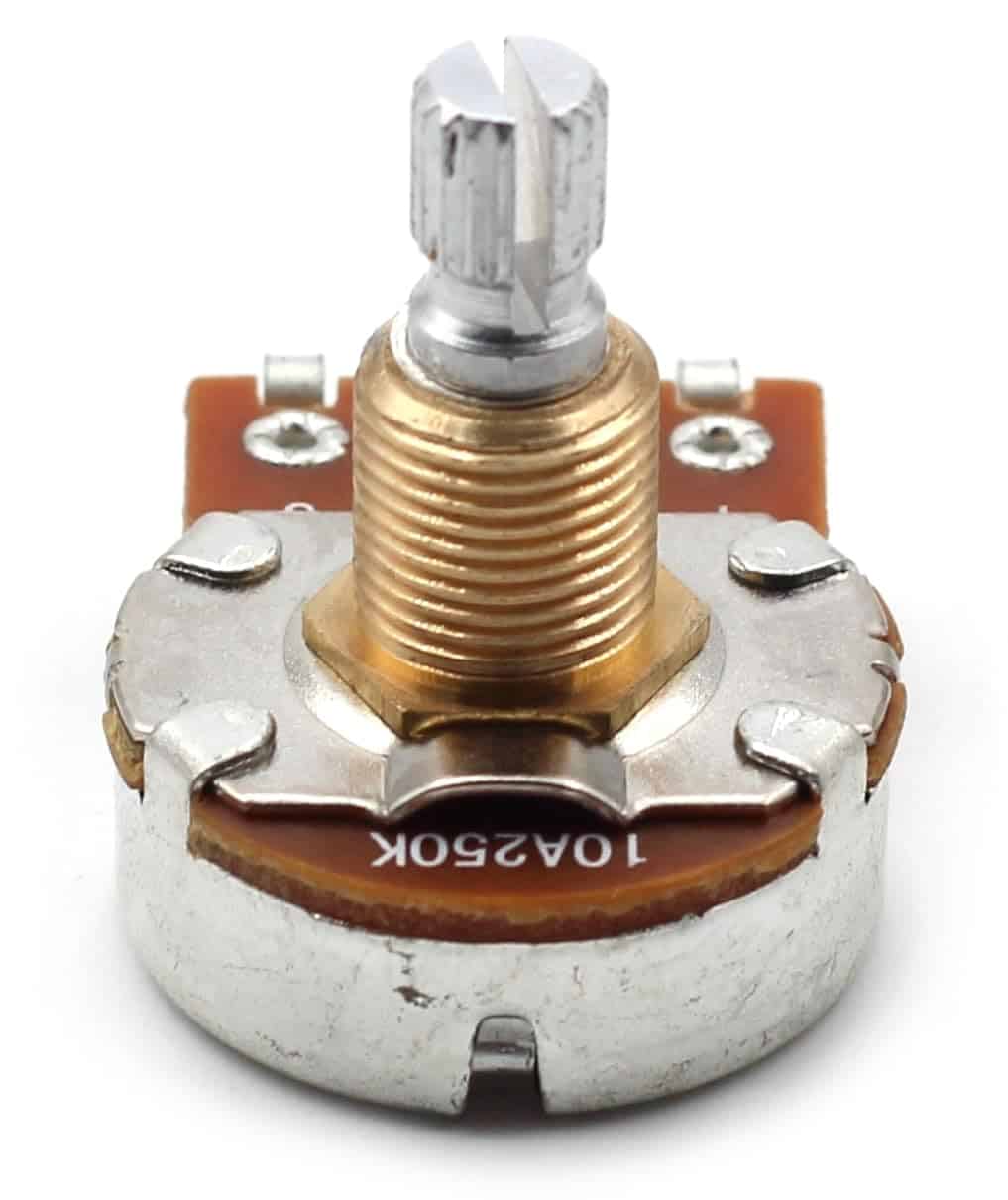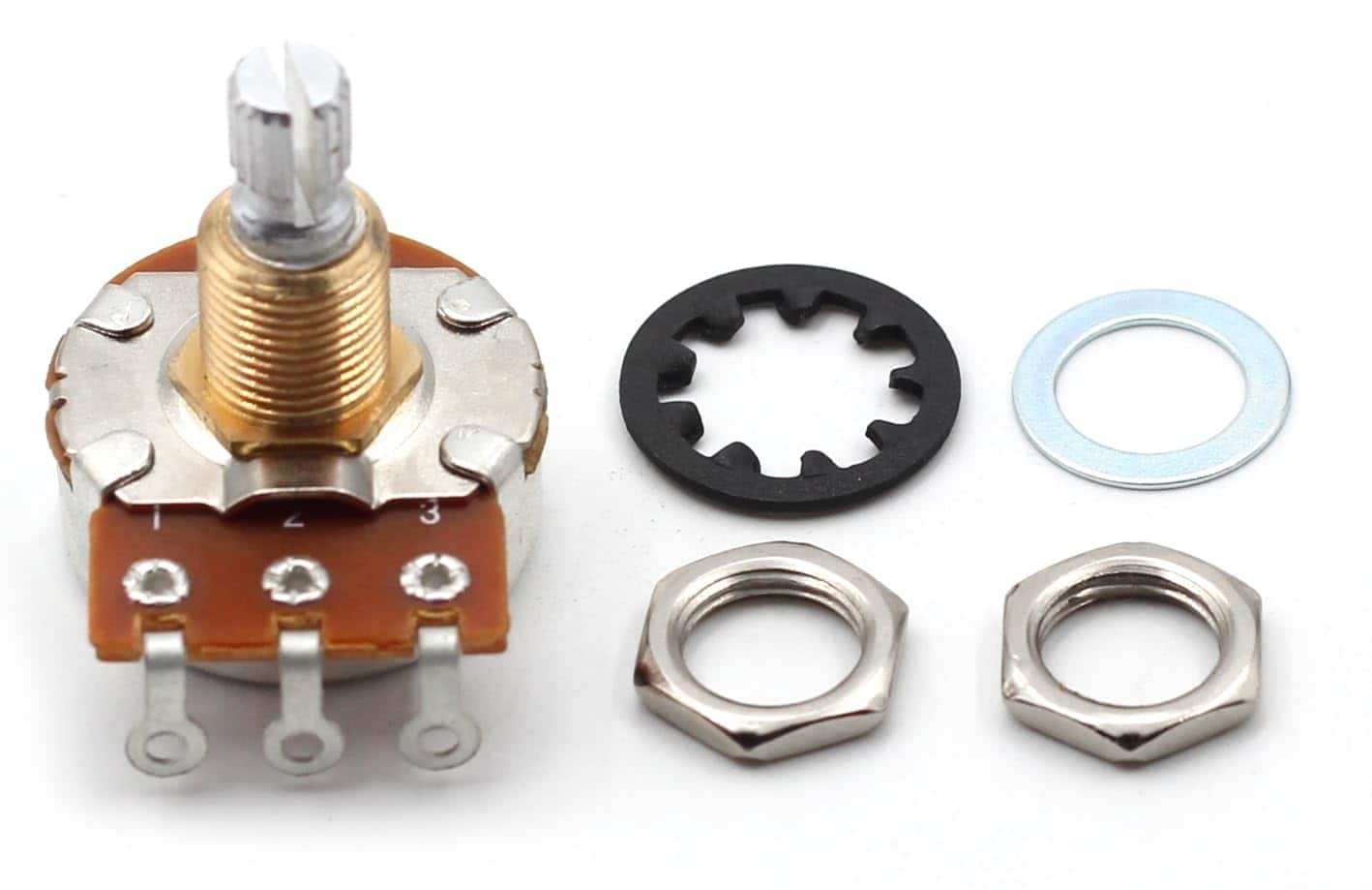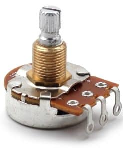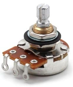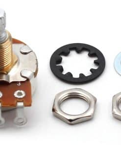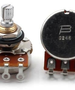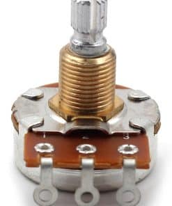 Juego de 3 potenciómetros Bourns 250K de eje corto con curva de audio de fricción baja. Bourns es una alternativa de calidad a los potenciómetros CTS. Estos potenciómetros de curva de audio son adecuados tanto para controles de tono como de volumen. Algunas características de este potenciómetro son: 250K Ohms/10% de tolerancia Curva de audio Fricción baja Eje de latón macizo de 3/8″ (eje corto) Estrías gruesas de 18 dientes, diámetro de .236″ Cada potenciómetro viene con herrajes – 2 tuercas y arandela de adorno Requiere agujero de montaje de 3/8″ Nota: 1. Este potenciómetro no es adecuado para su uso con guitarras de importación. 2. Este potenciómetro tiene un casquillo de 3/8″. Al instalarlo en una Strat u otra montura de golpeador a través, use la segunda tuerca como espaciador debajo del golpeador. Esto asegurará que sus perillas estén cerca del cuerpo, o permitirá que el potenciómetro se iguale con los potenciómetros que usan un casquillo de 1/4″.