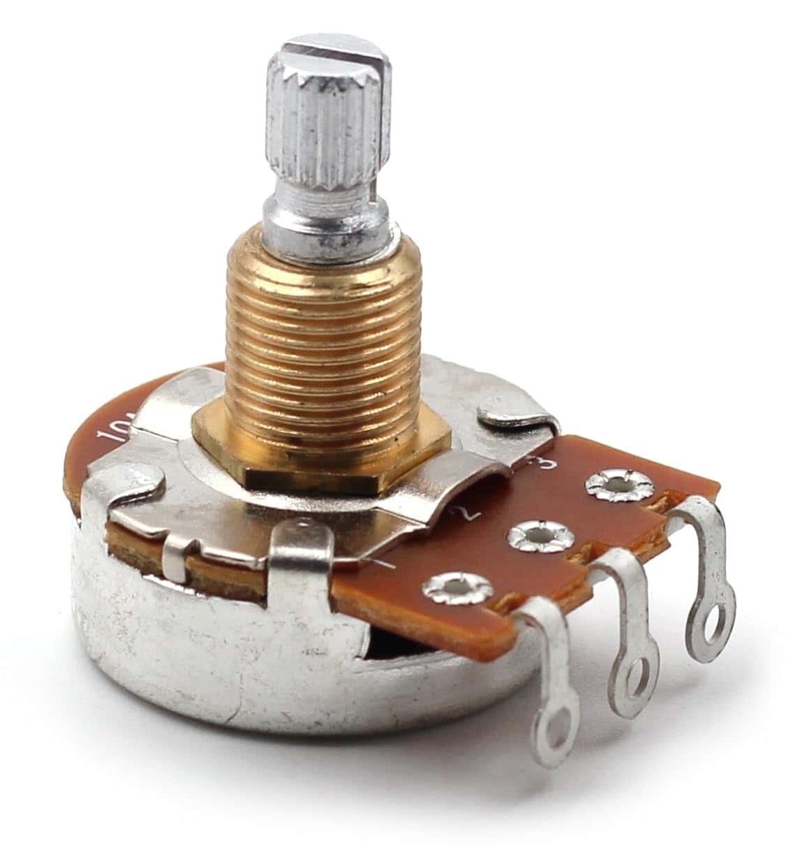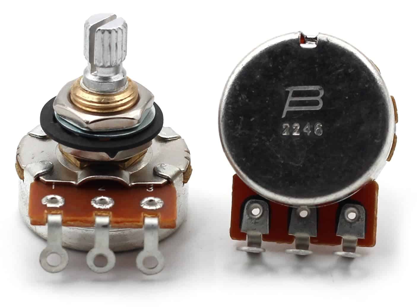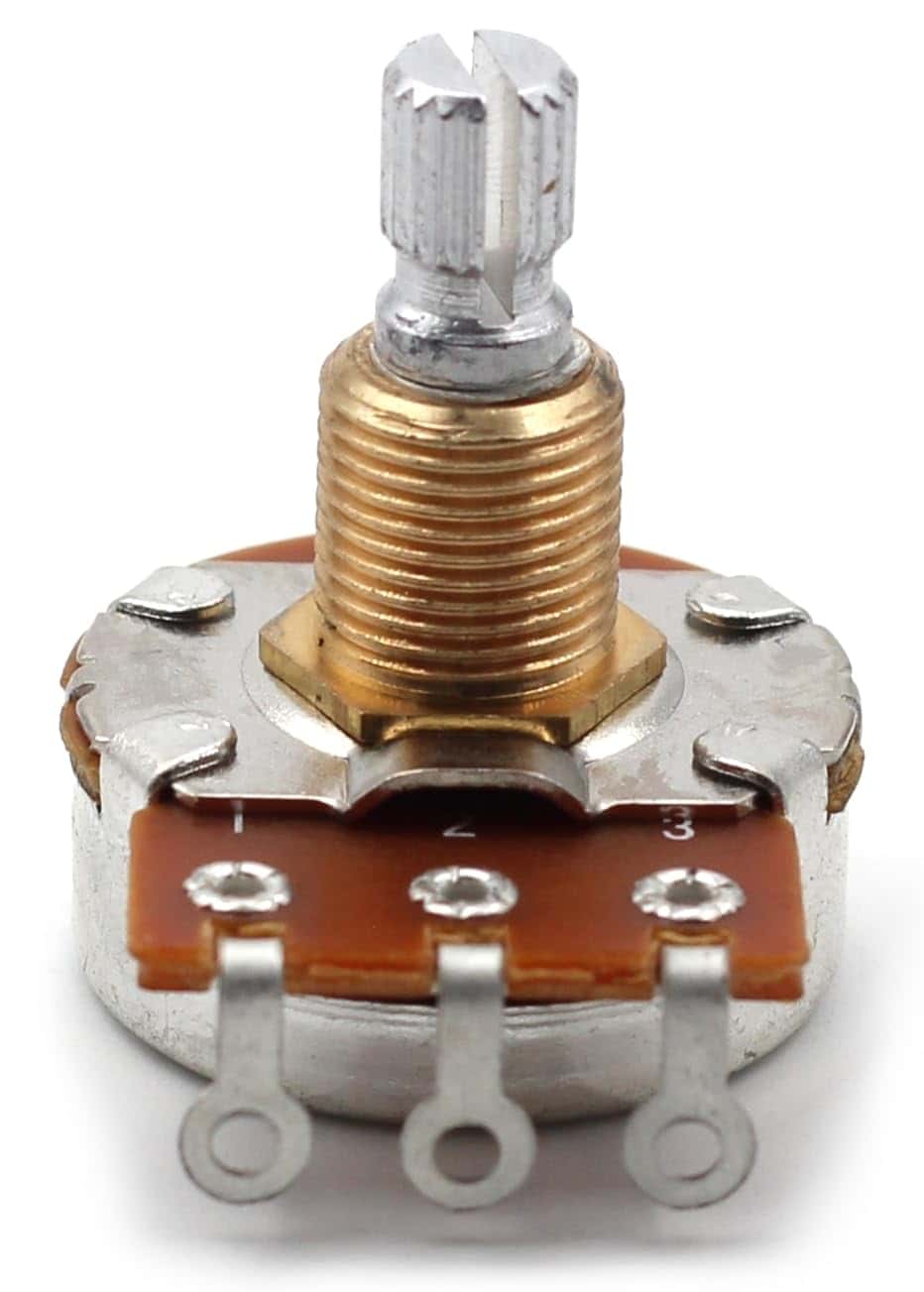 Juego de 3 potenciómetros Bourns 250K de eje corto con curva de audio de fricción baja. Bourns es una alternativa de calidad a los potenciómetros CTS. Estos potenciómetros de curva de audio son adecuados tanto para controles de tono como de volumen. Algunas características de este potenciómetro son: 250K Ohms/10% de tolerancia Curva de audio Fricción baja Eje de latón macizo de 3/8″ (eje corto) Estrías gruesas de 18 dientes, diámetro de .236″ Cada potenciómetro viene con herrajes – 2 tuercas y arandela de adorno Requiere agujero de montaje de 3/8″ Nota: 1. Este potenciómetro no es adecuado para su uso con guitarras de importación. 2. Este potenciómetro tiene un casquillo de 3/8″. Al instalarlo en una Strat u otra montura de golpeador a través, use la segunda tuerca como espaciador debajo del golpeador. Esto asegurará que sus perillas estén cerca del cuerpo, o permitirá que el potenciómetro se iguale con los potenciómetros que usan un casquillo de 1/4″.