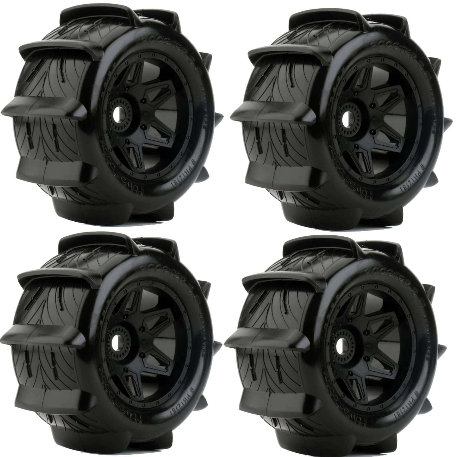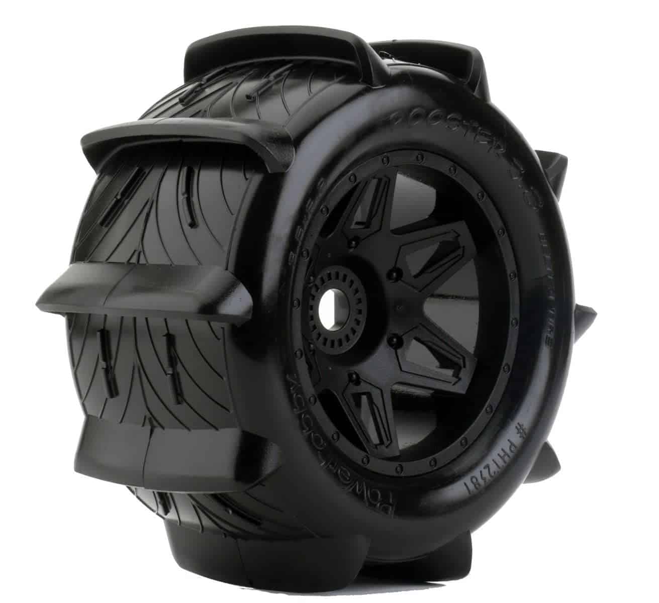 Powerhobby 1/8 Rooster 3.8 Ruedas de Arena con Pala y Correa Montadas en Llantas de 17 mm Hex Este es un par de ruedas de camión Rooster 3.8″ premontadas para arena o nieve. Estas ruedas están con correa, por lo que ya no hay hinchazón de neumáticos. Las ruedas Rooster proporcionan horas de diversión en la arena, nieve o incluso en charcos de barro ocasional. Las once palas garantizan un rendimiento máximo debido al diseño de verdadero cucharón junto con paredes laterales exteriores de bajo rodar. Características: Perfil suave/medio tratado para la máxima tracción y agarre lateral Cinta interior flexible pero muy resistente, vulcanizada directamente junto con el compuesto de la llanta Insertar espuma con material especial para altas temperaturas, corte WJ para alta precisión Llanta de radios moldeada con material especial y con una estructura flexible para máxima agarre y estabilidad Especificaciones: Hexágono de la llanta: 17mm Desplazamiento de 1/2″ Altura: 6.8″ Ancho: 3.5″ Peso: 10 onzas por rueda Incluye: Cuatro Ruedas Pre-Montadas
