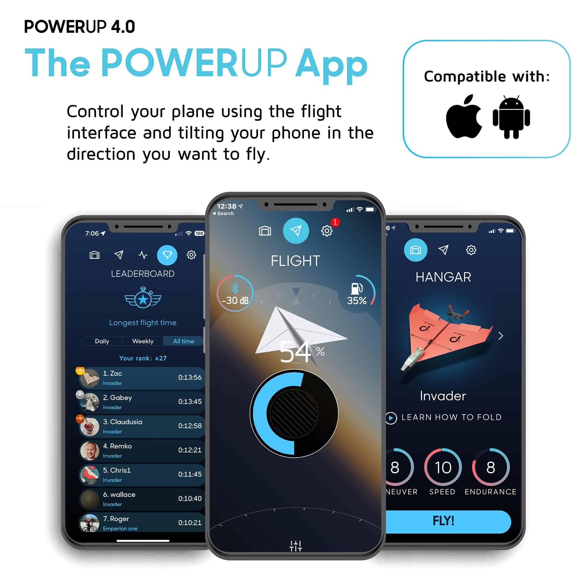 3. VUELO CONECTADO – Empareja tu avión con la aplicación POWERUP para maniobrar tu avión, mantener un sólido registro de vuelo, competir con otros pilotos en la tabla de clasificación y aprender a plegar nuevos diseños de aviones.