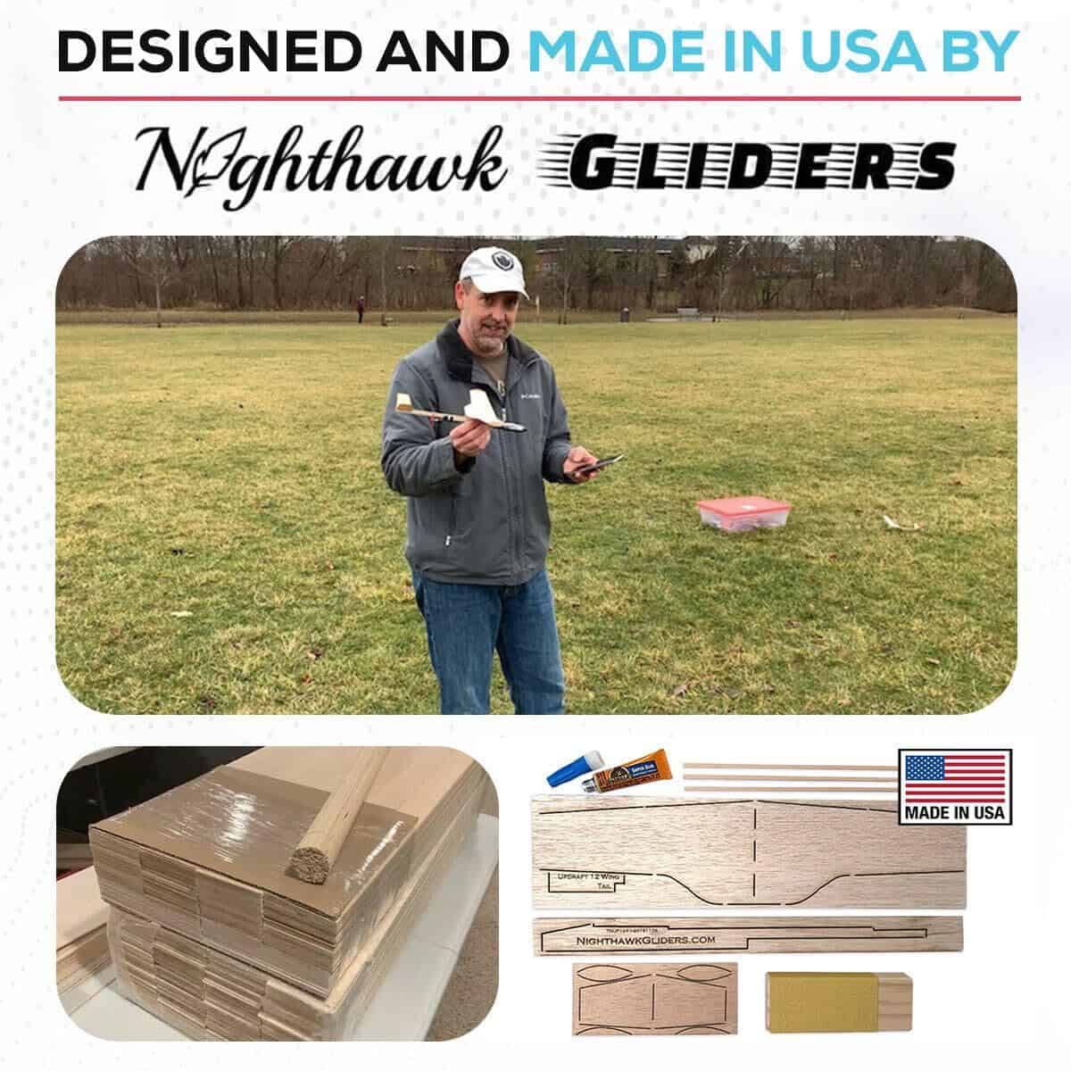 6. HECHO EN EE. UU. – Diseñado y creado en EE. UU. por Brad y Bruce Williamson de Nighthawk Gliders, este avión de madera de balsa, meticulosamente cortado con láser y diseñado a mano, utiliza materiales de primera calidad.