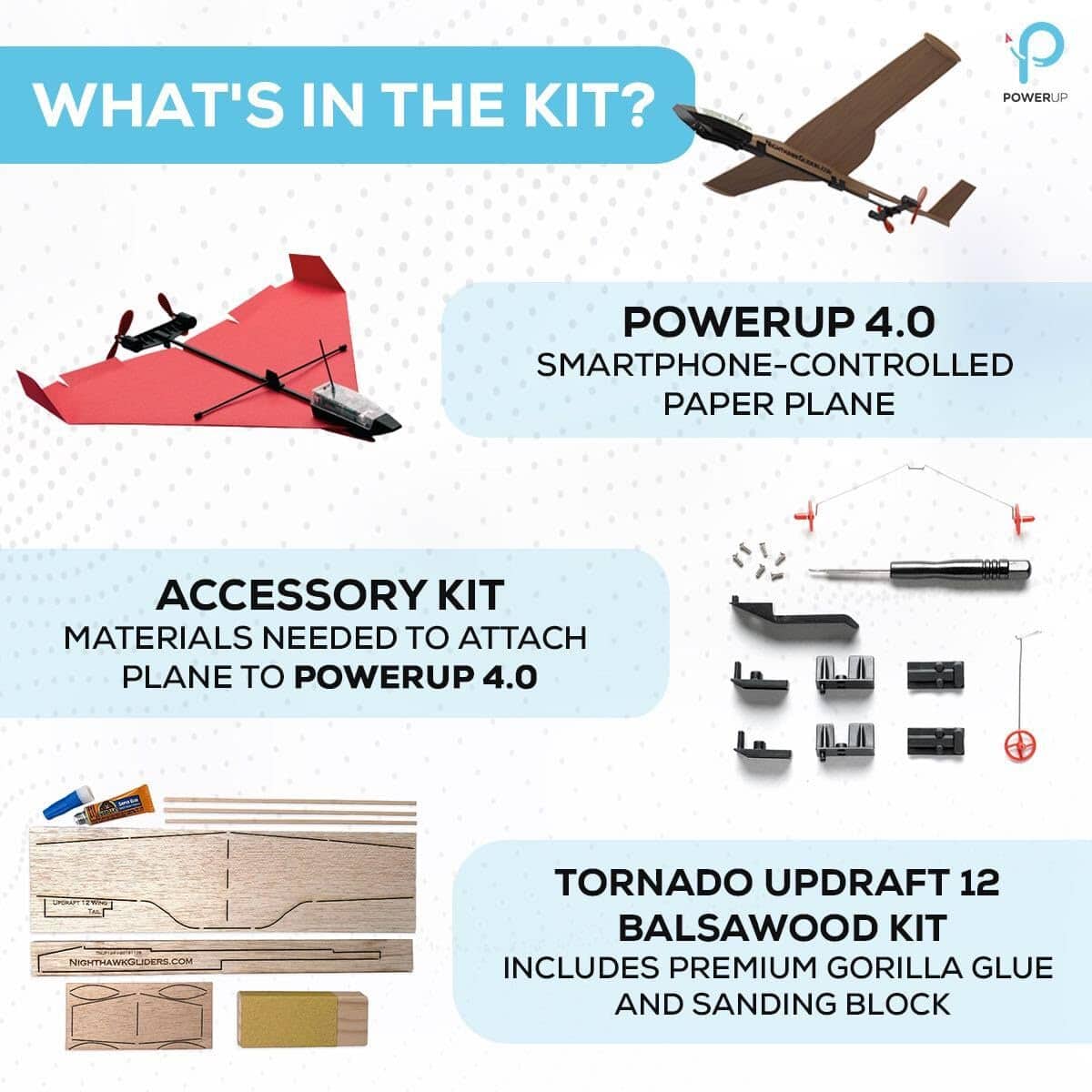 2. PLANEADOR DE MADERA DE BALSA – Conocido por su alta calidad y rendimiento, el kit de avión de madera de balsa Tornado Updraft 12 tiene una característica de vuelo rápido y maniobrable. ¿Quieres ver volar tus planeadores de madera de balsa por más de unos segundos? ¡Combina nuestro planeador con el POWERUP 4.0 controlado por smartphone y tu planeador volará por hasta 10 minutos!